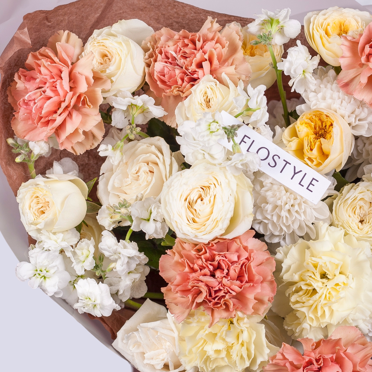 Состав: Роза Playa Blanca - 5 шт, Роза кустовая White Juliet - 3 шт, Диантус Brown - 7 шт, Диантус Yellow - 3 шт, Хризантема Altaj - 2 шт, Маттиола кустовая White - 3 шт, Тишью коричневая, Матовая пленка белая ушками