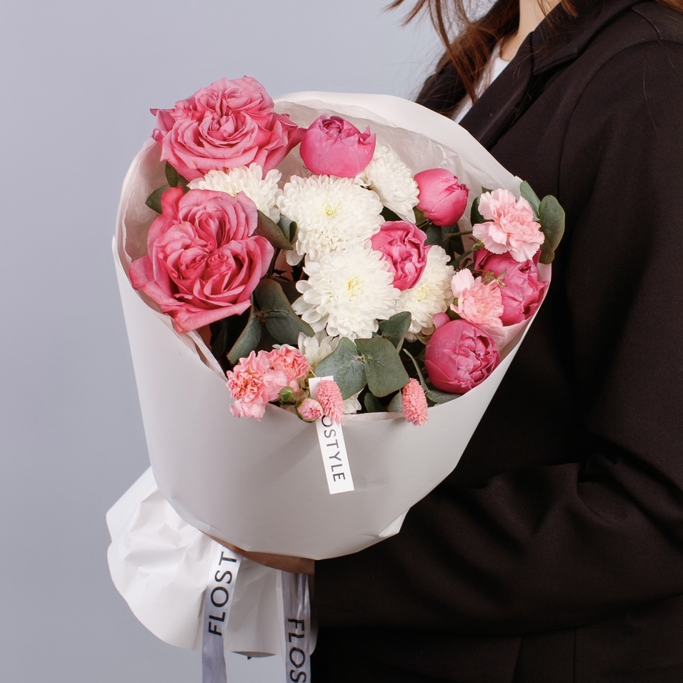 Состав: Роза Country Blues - 2 шт, Хризантема Altaj - 1 шт, Роза кустовая Misty Bubbles - 1 шт, Диантус кустовой Pink - 2 шт, Фалярис розовый - 3 шт, Эвкалипт - 0,5 шт, Белая Тишью, Матовая пленка белая кругом