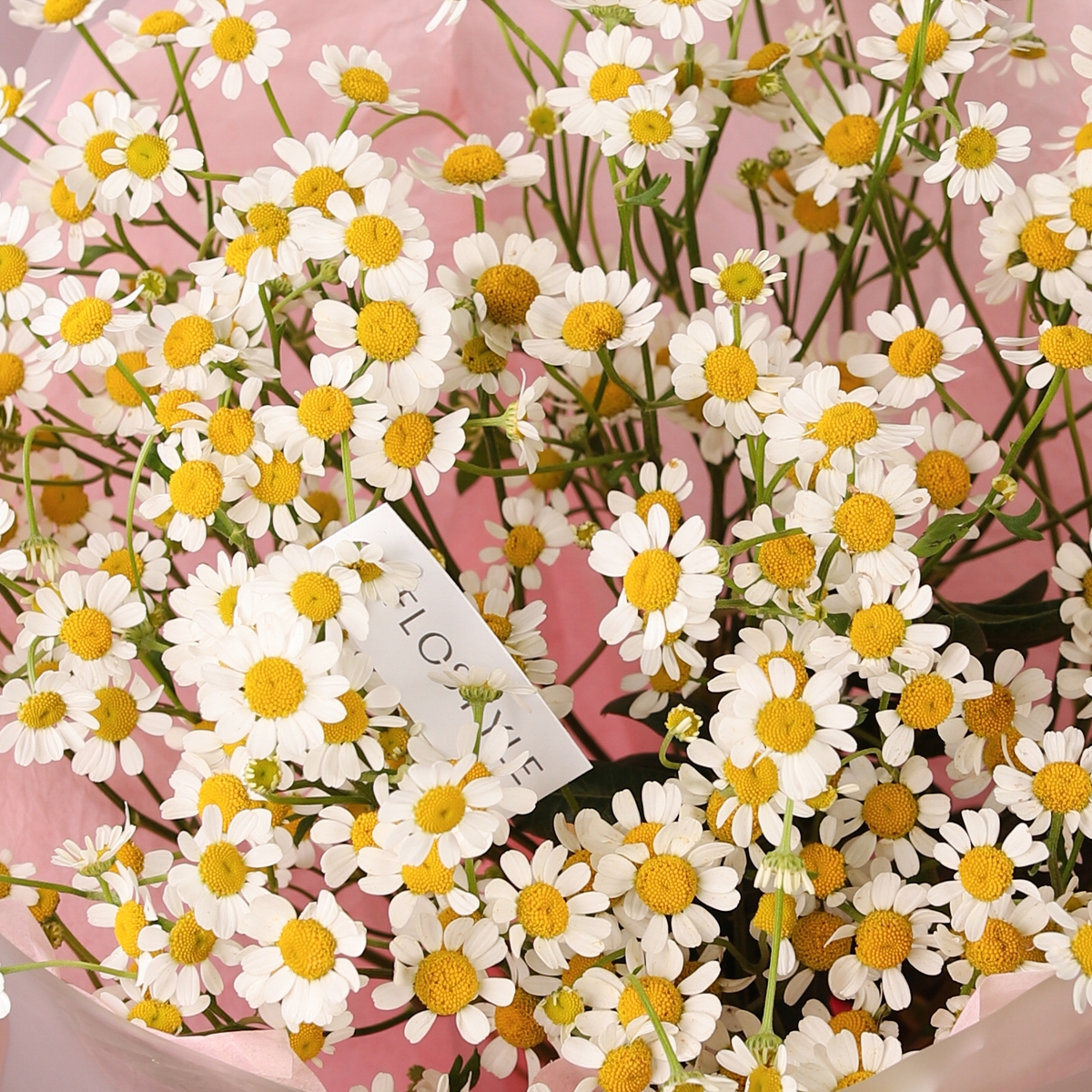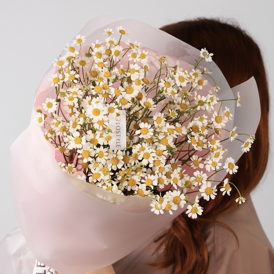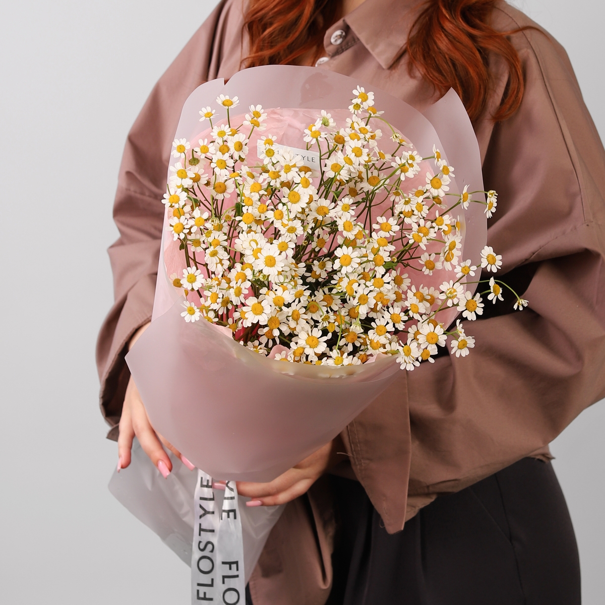 Состав: Ромашка танацетум - 7 шт, Фисташка - 1 шт, Тишью розовое, Матовая пленка полупрозрачная кругом
