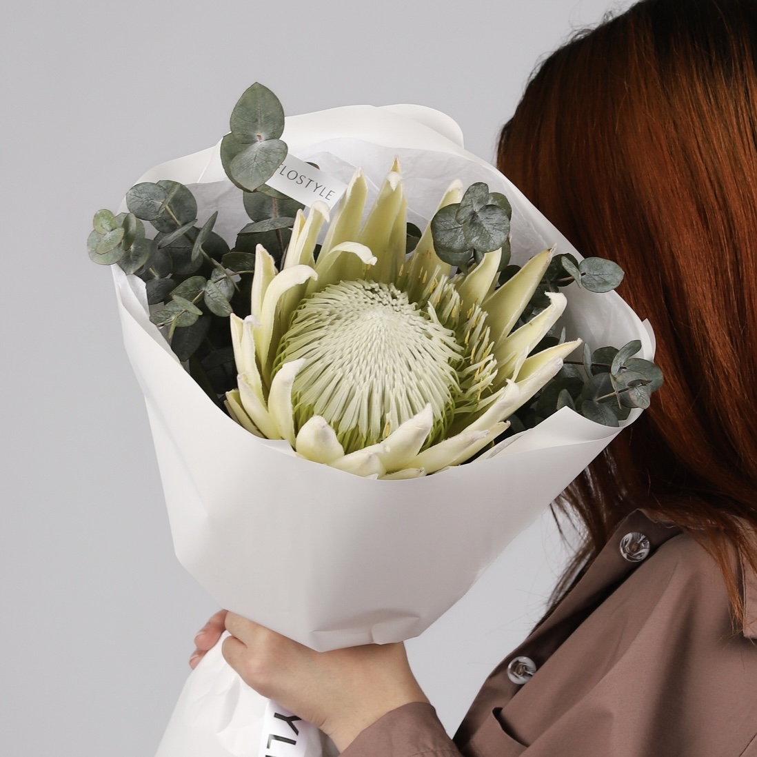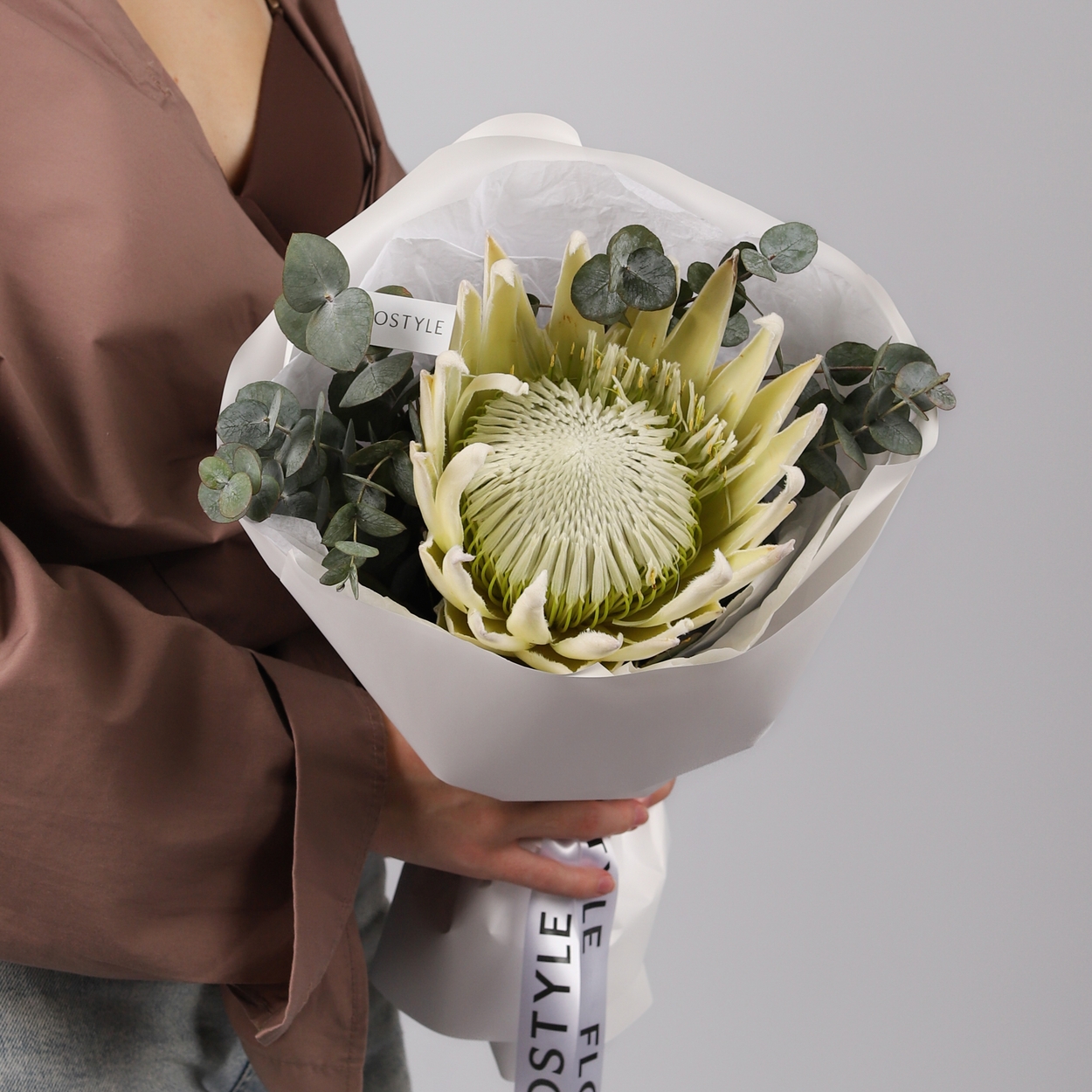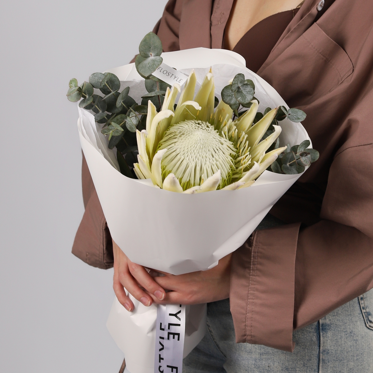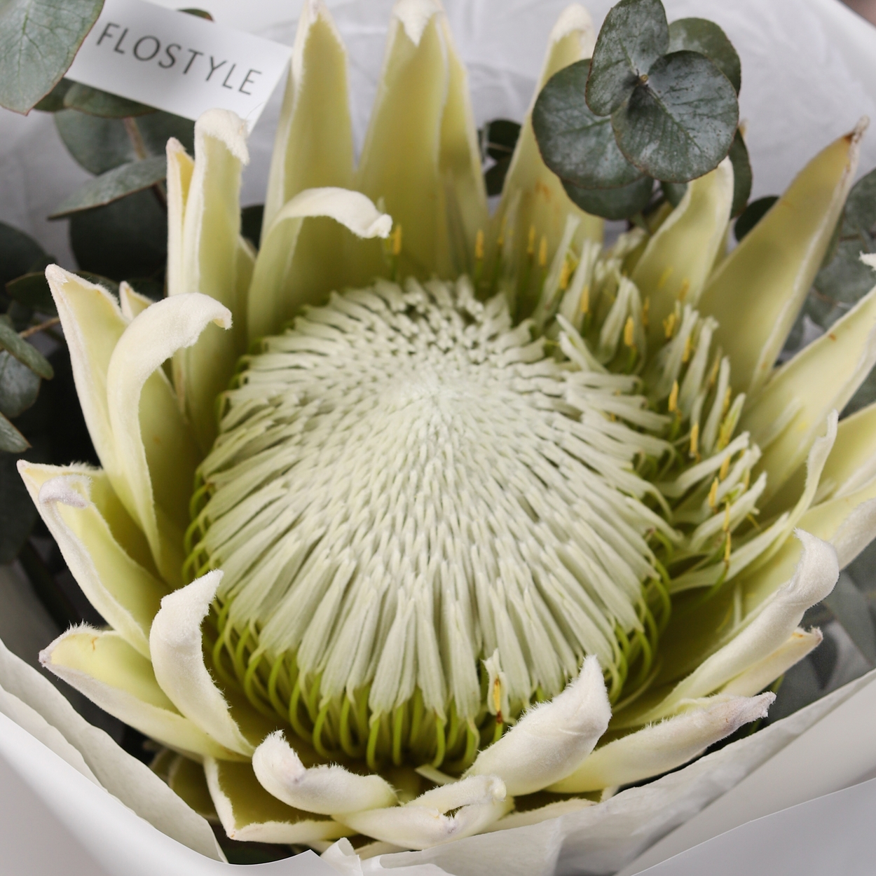 Состав: Протея White - 1 шт, Эвкалипт - 0,5 шт, Тишью белая, Матовая пленка белая кругом