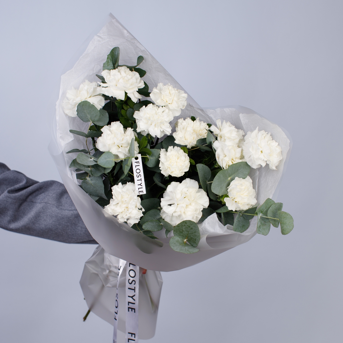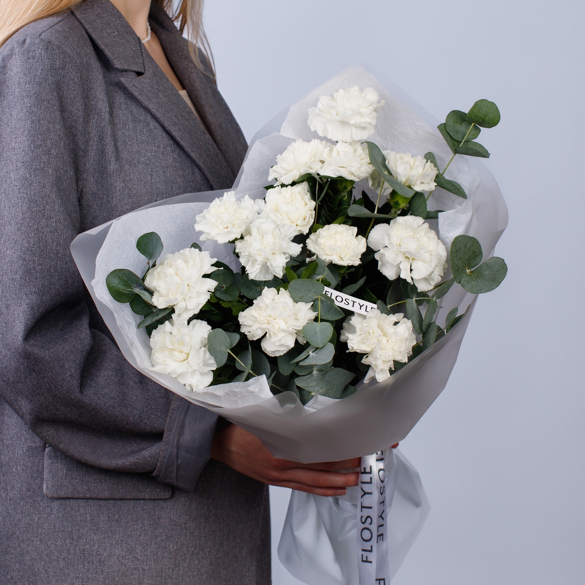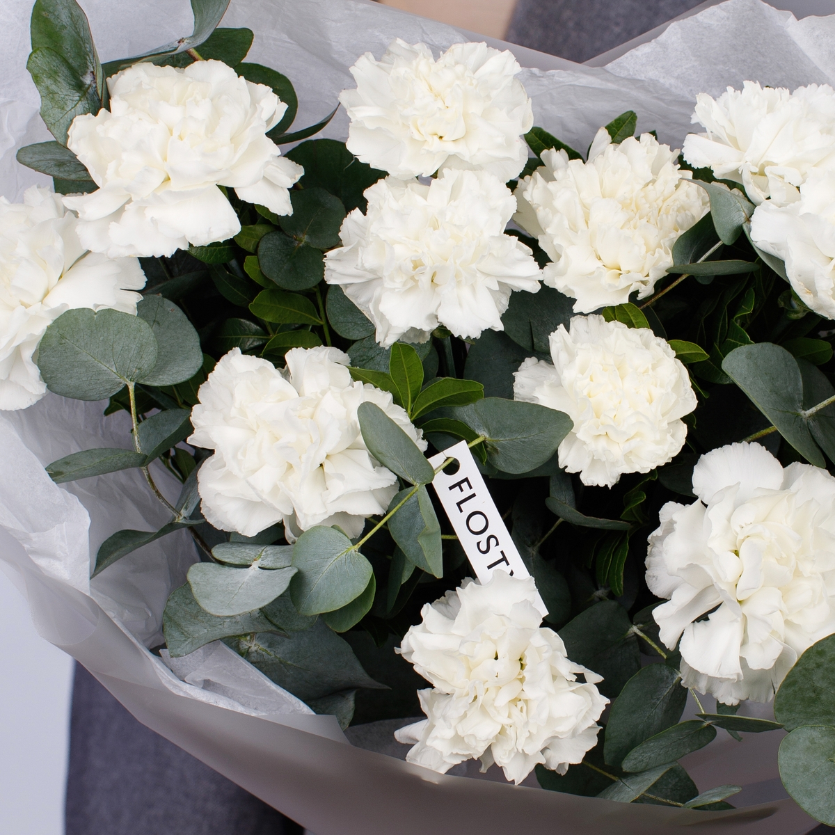 Состав: Диантус White - 13 шт, Эвкалипт - 0,5 шт, Фисташка - 2 шт, Тишью белая, Матовая пленка белая ушками