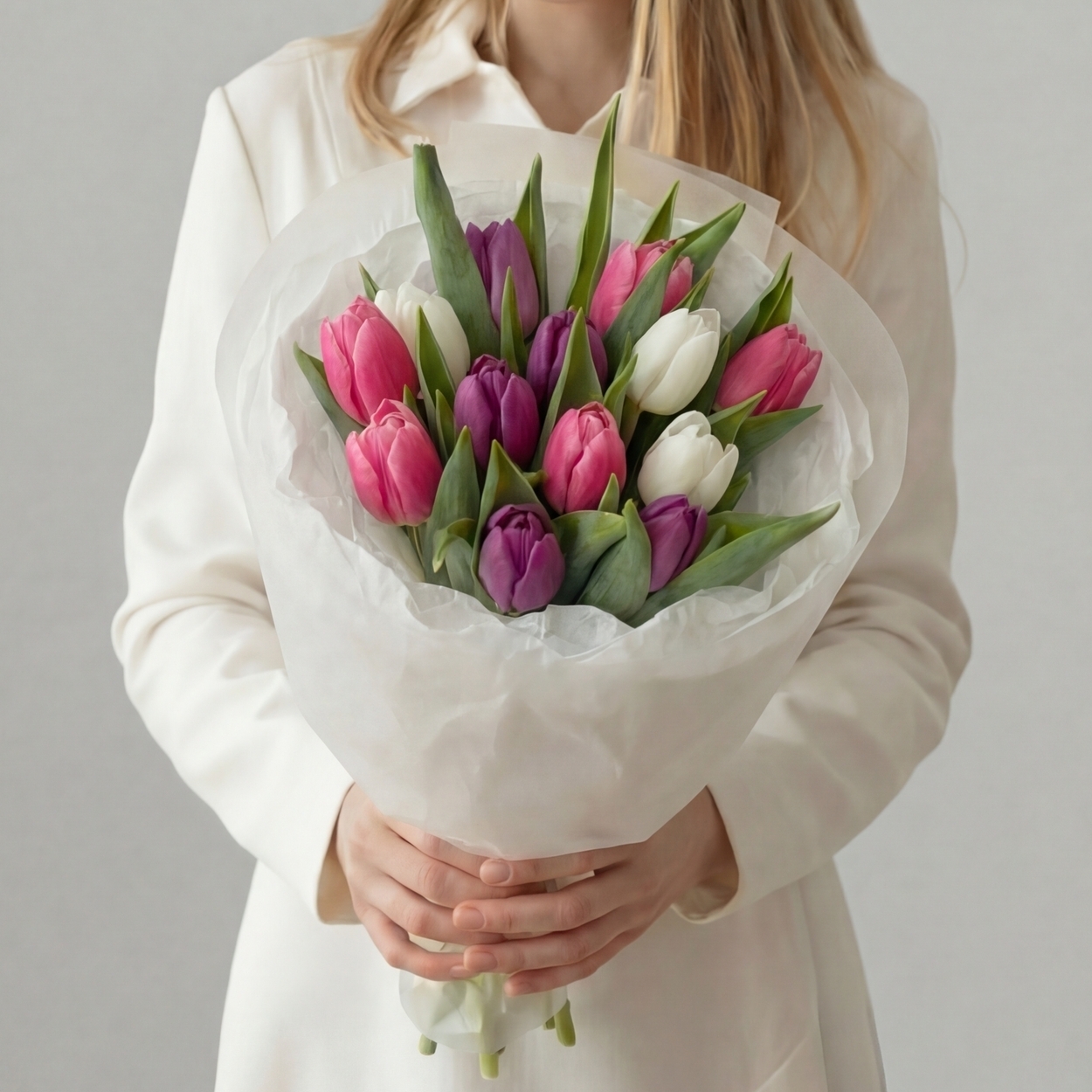 Состав: Тюльпан микс обычный (роз, фиолет, бел)- 11 шт, Тишью белая, Матовая пленка белая кругом