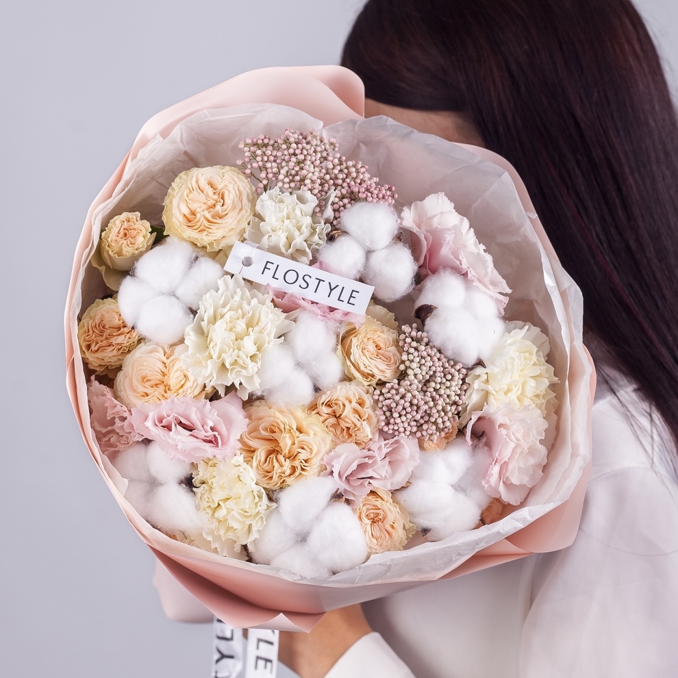 Состав: Роза кустовая Summerrose - 3 шт, Диантус White - 5 шт, Эустома Pink - 2 шт, Озотамнус Pink - 2 шт, Хлопок White - 7 шт, Фисташка - 1 шт, Тишью белая, Матовая пленка розовая кругом