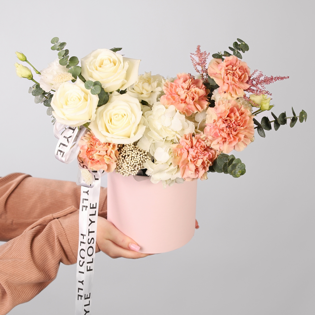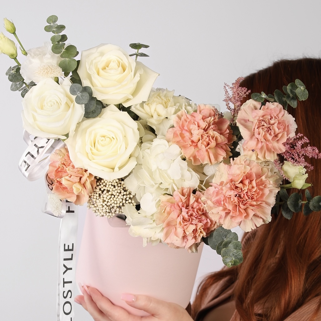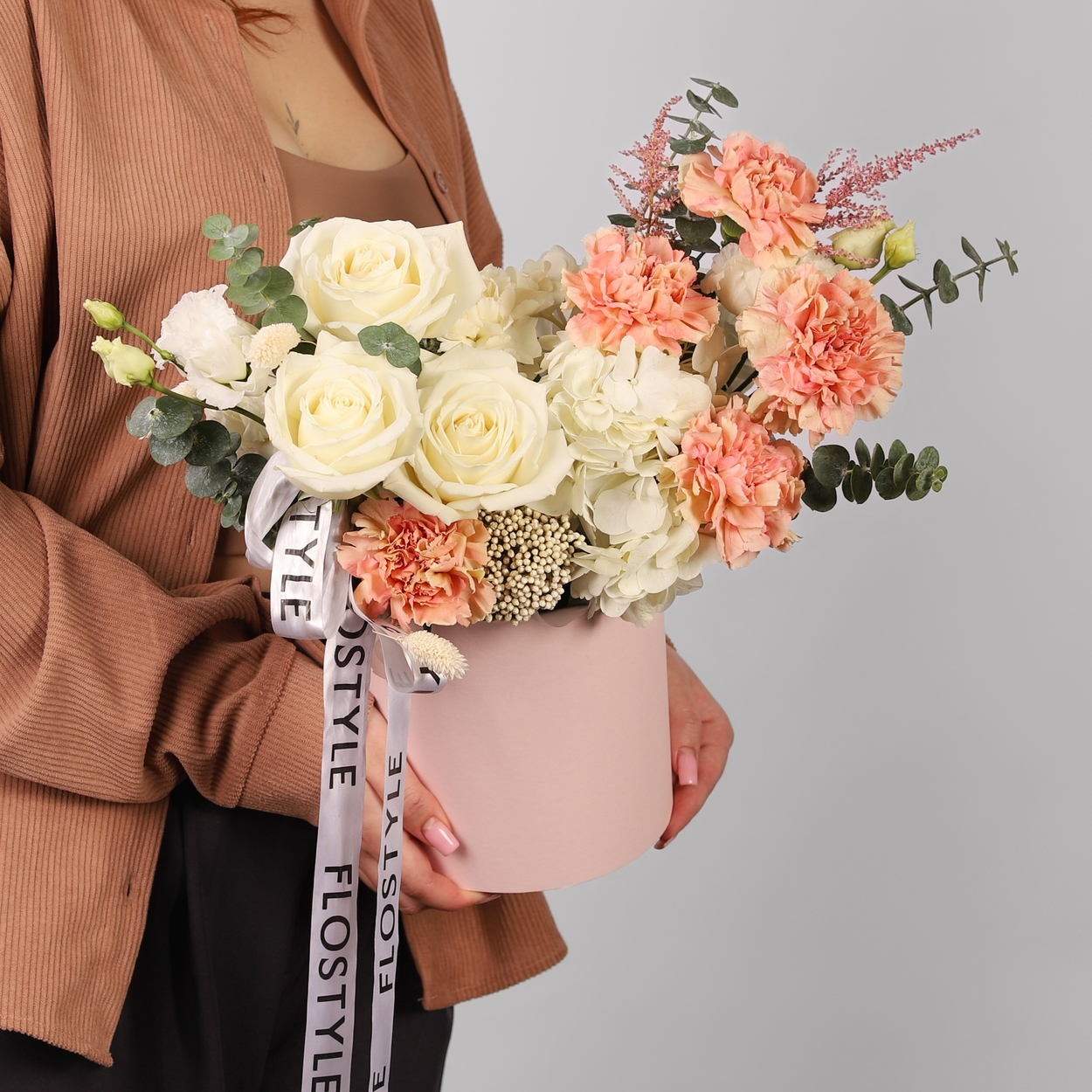 Состав: Коробка розовая S, Роза Playa Blanca - 3 шт, Гортензия White - 1 шт, Диантус Apple Tea - 5 шт, Диантус White - 4 шт, Эустома White - 2 шт, Озотамнус - 1 шт, Астильба - 2 шт, Фисташка - 2 шт, Эвкалипт - 0,5 шт, Лента Атласная