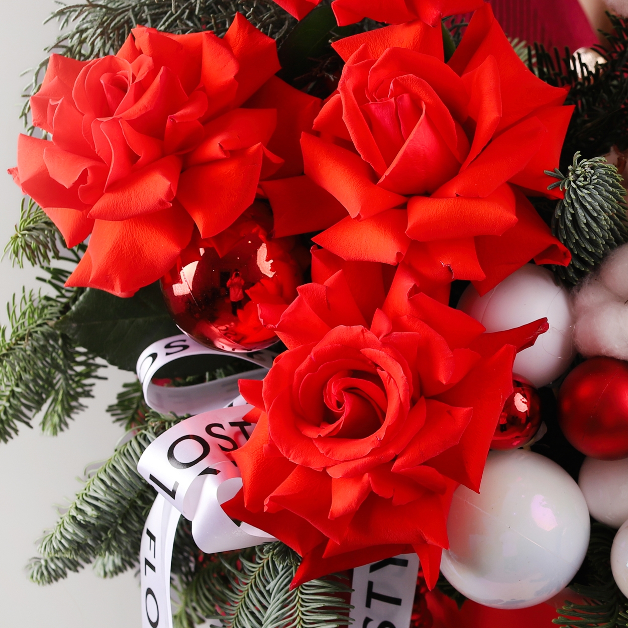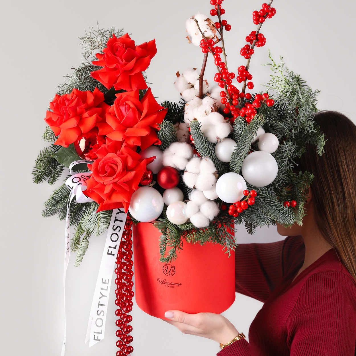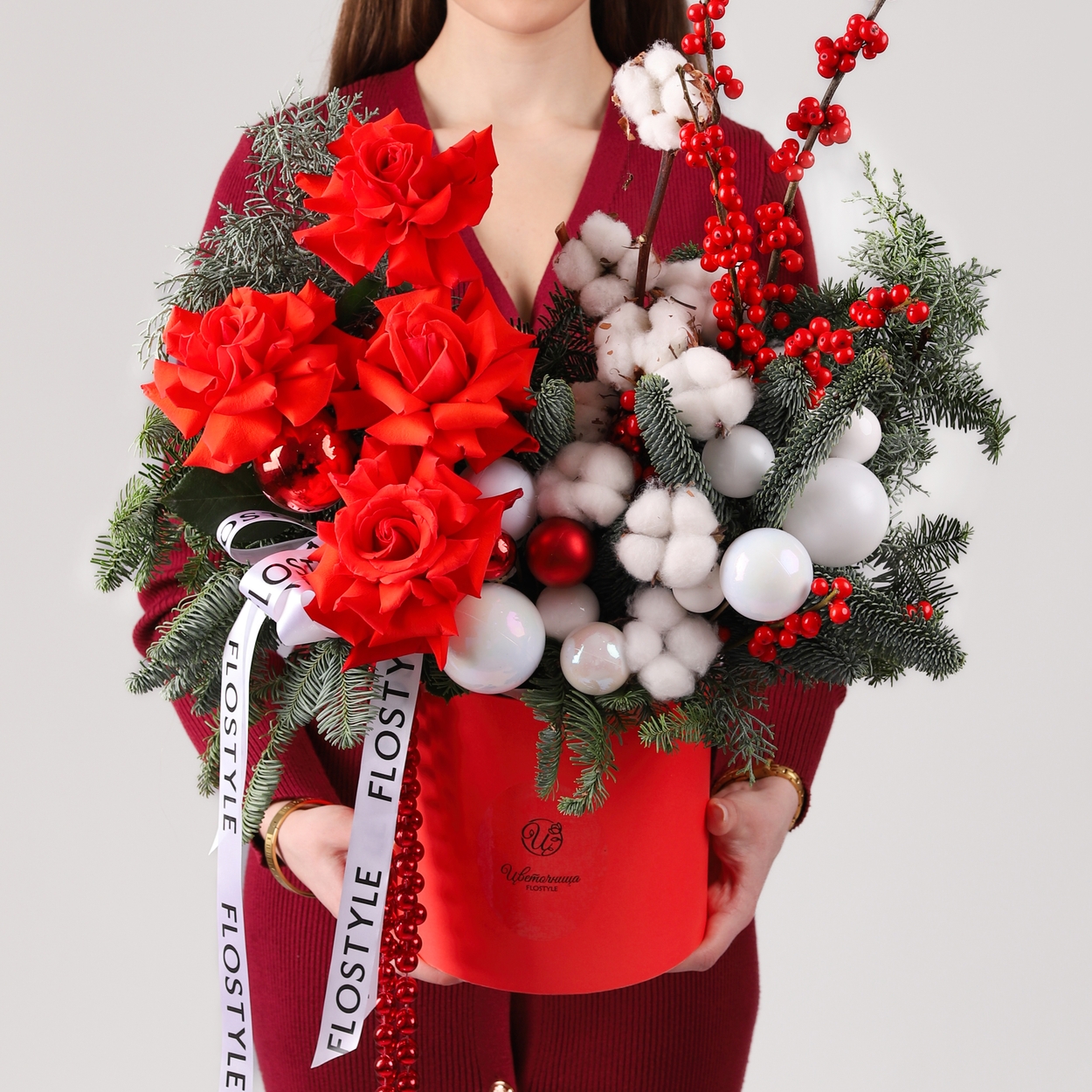 Состав: Коробка M красная, Роза Nina французская - 4 шт, Хлопок - 11 шт, Шар большой - 3 шт, Шар средний - 6 шт, Шар маленький - 5 шт, Илекс - 1 шт, Кипарис - 1 шт, Нобилис - 2 шт, Бусы - 1 шт