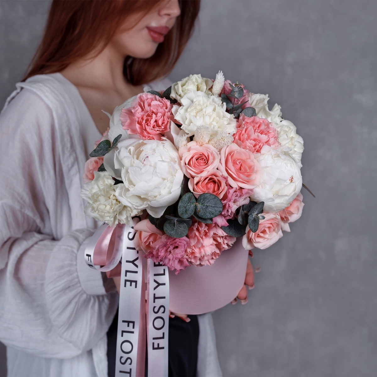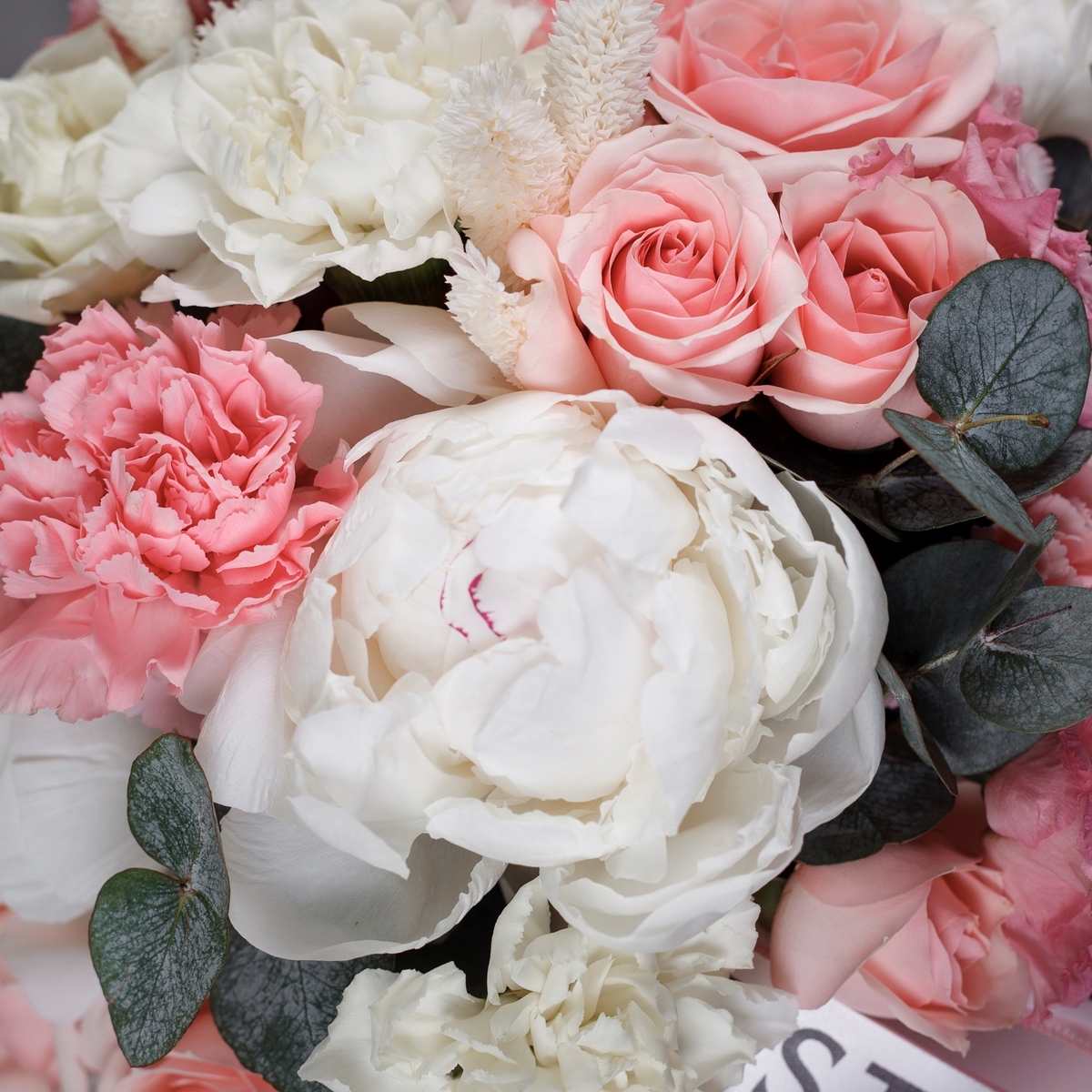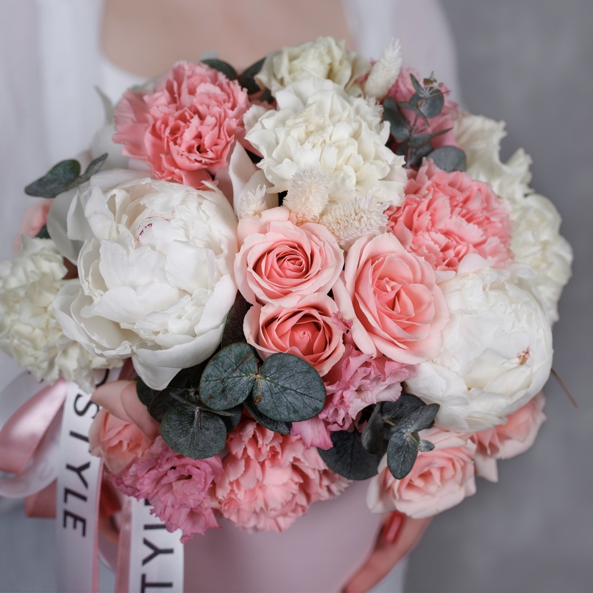 Состав: Коробка S (Pink), Пионы White - 3 шт, Роза кустовая Star Blush - 3 шт, Диантус Pink - 5 шт, Диантус White - 4 шт, Эустома Pink - 2 шт, Фалярис - 3 шт, Атласная лента