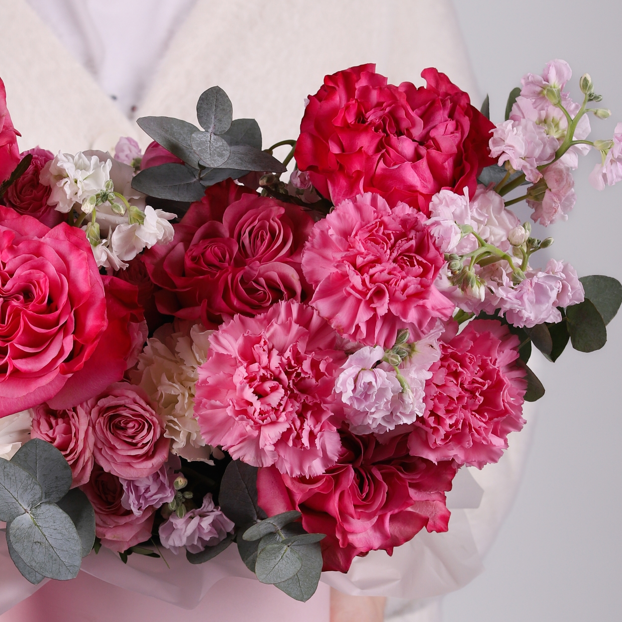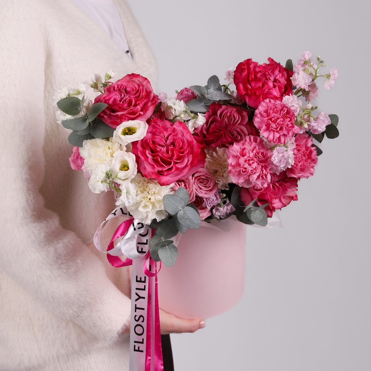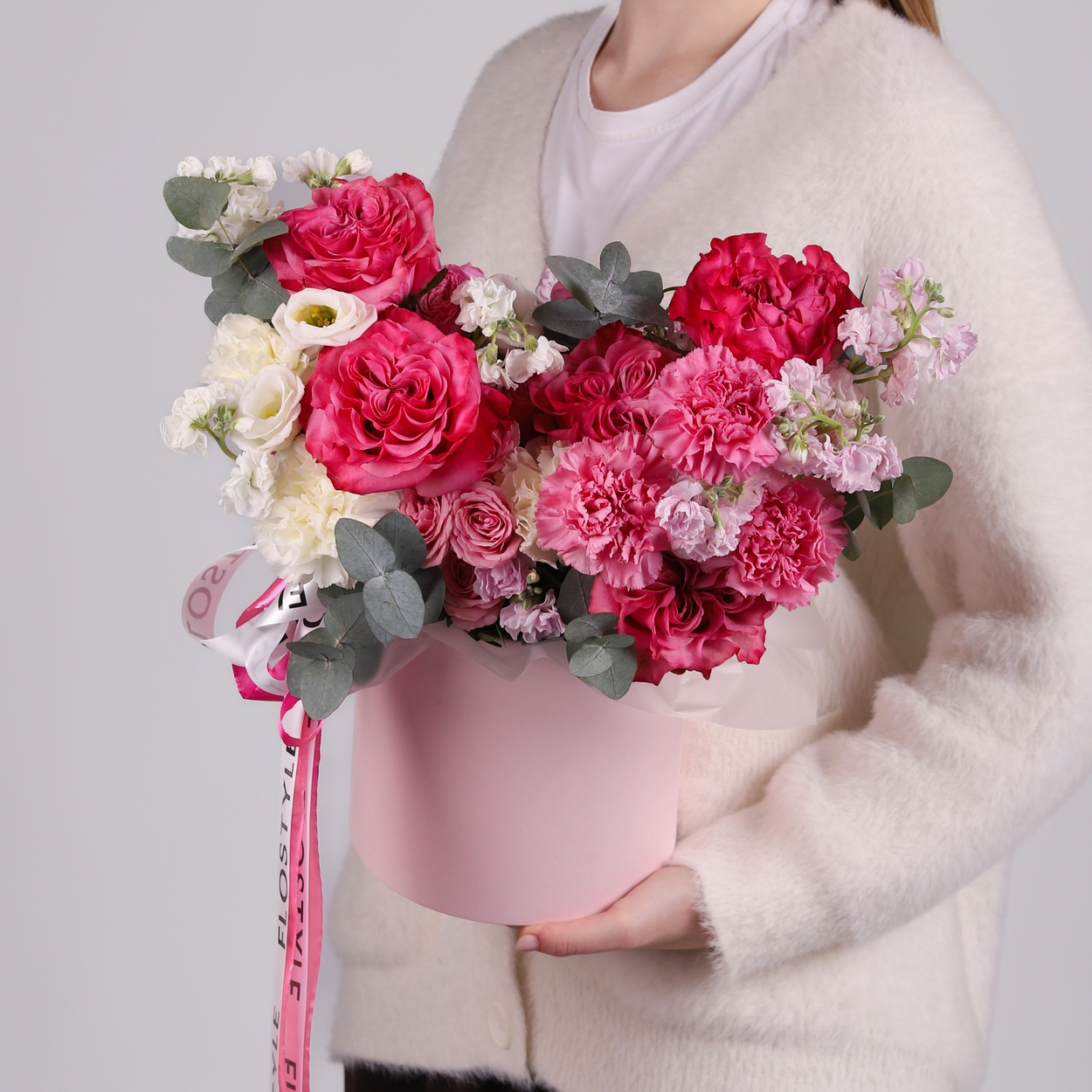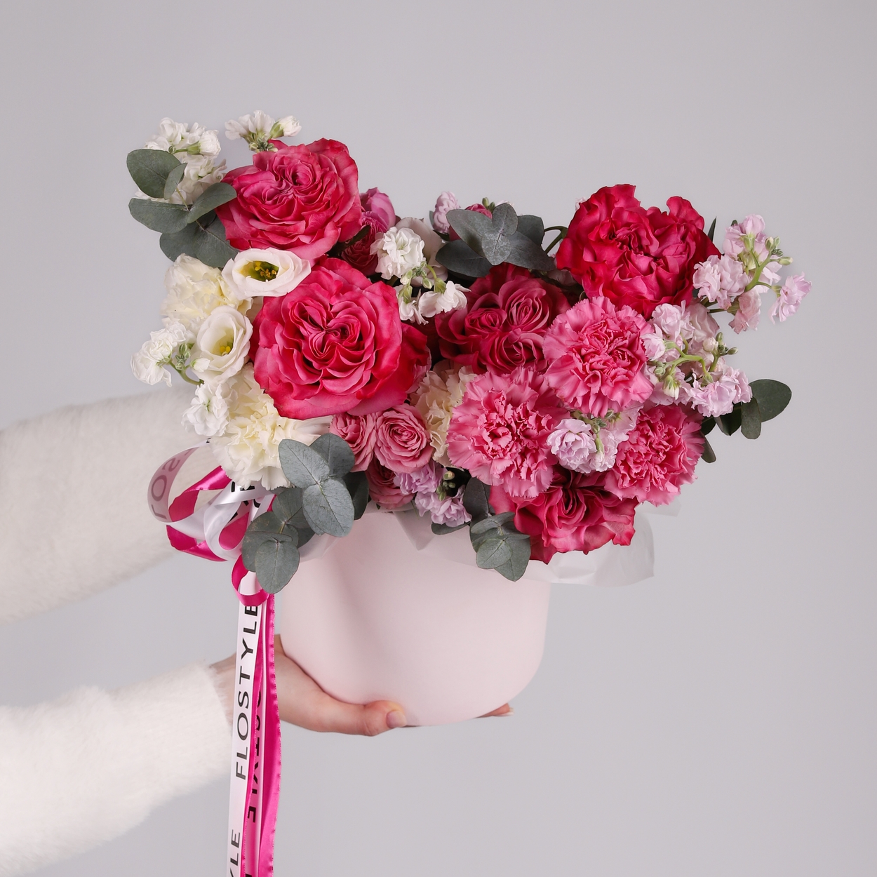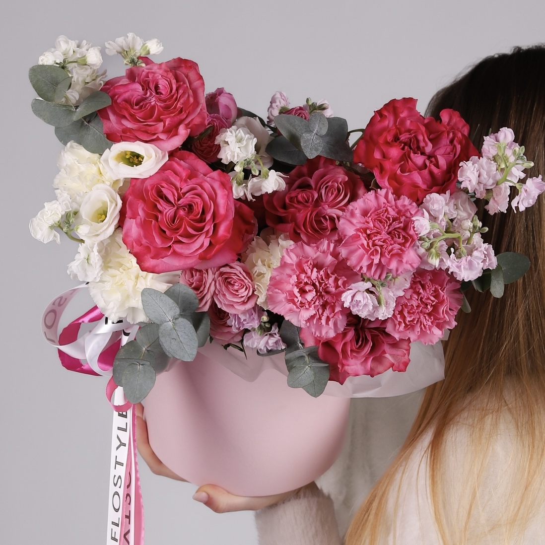 Состав: Коробка розовая M, Роза Country Blues - 5 шт, Роза кустовая Lady Bomdastic - 4 шт, Диантус White - 3 шт, Диантус Purple - 5 шт, Маттиола Pink - 2 шт, Маттиола White - 1 шт, Эустома White - 1 шт, Эвкалипт - 1 шт, Лента атласная
