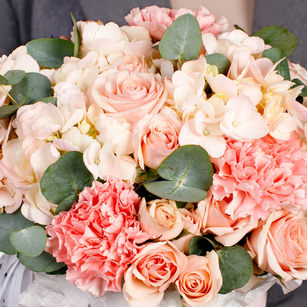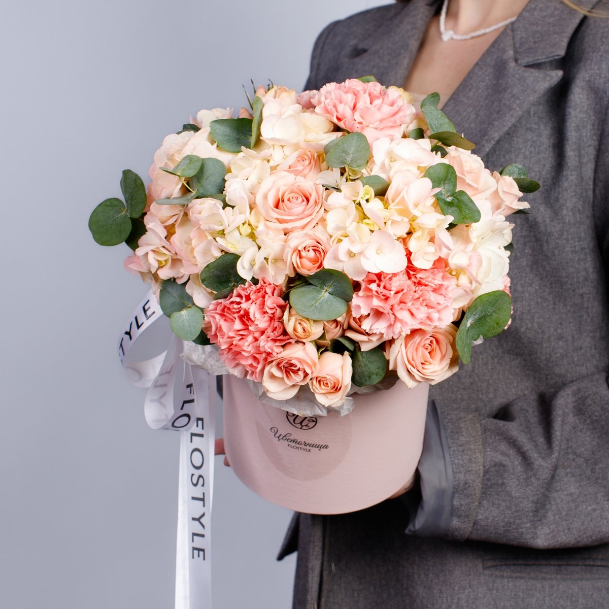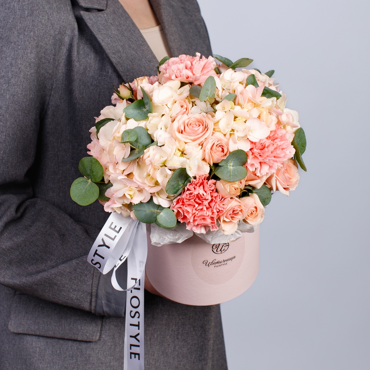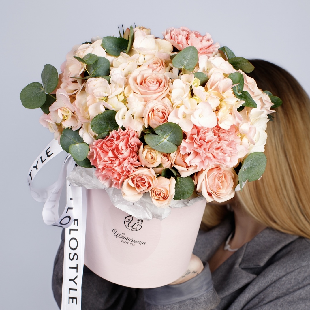 Состав: Коробка S (Pink), Гортензия Pink - 2 шт, Роза кустовая Star Blush - 2 шт, Диантус Pink - 3 шт, Эвкалипт - 0,5 шт, Фисташка - 1 шт, Лента атласная