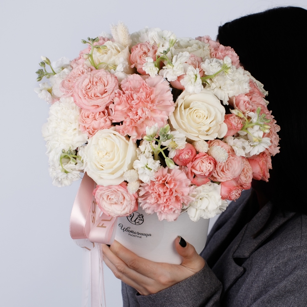 Состав: Коробка белая S, Роза Playa Blanca - 5 шт, Роза кустовая Madam Bombastic - 4 шт, Гвоздика White/Pink - 13 шт, Маттиола кустовая White - 2 шт, Фалярис - 6 шт, Лента атласная