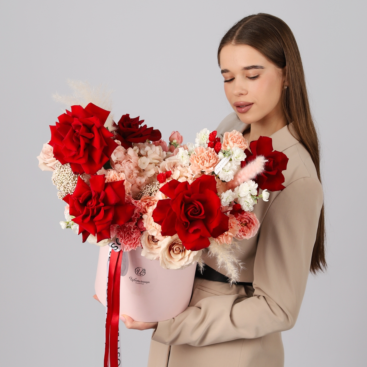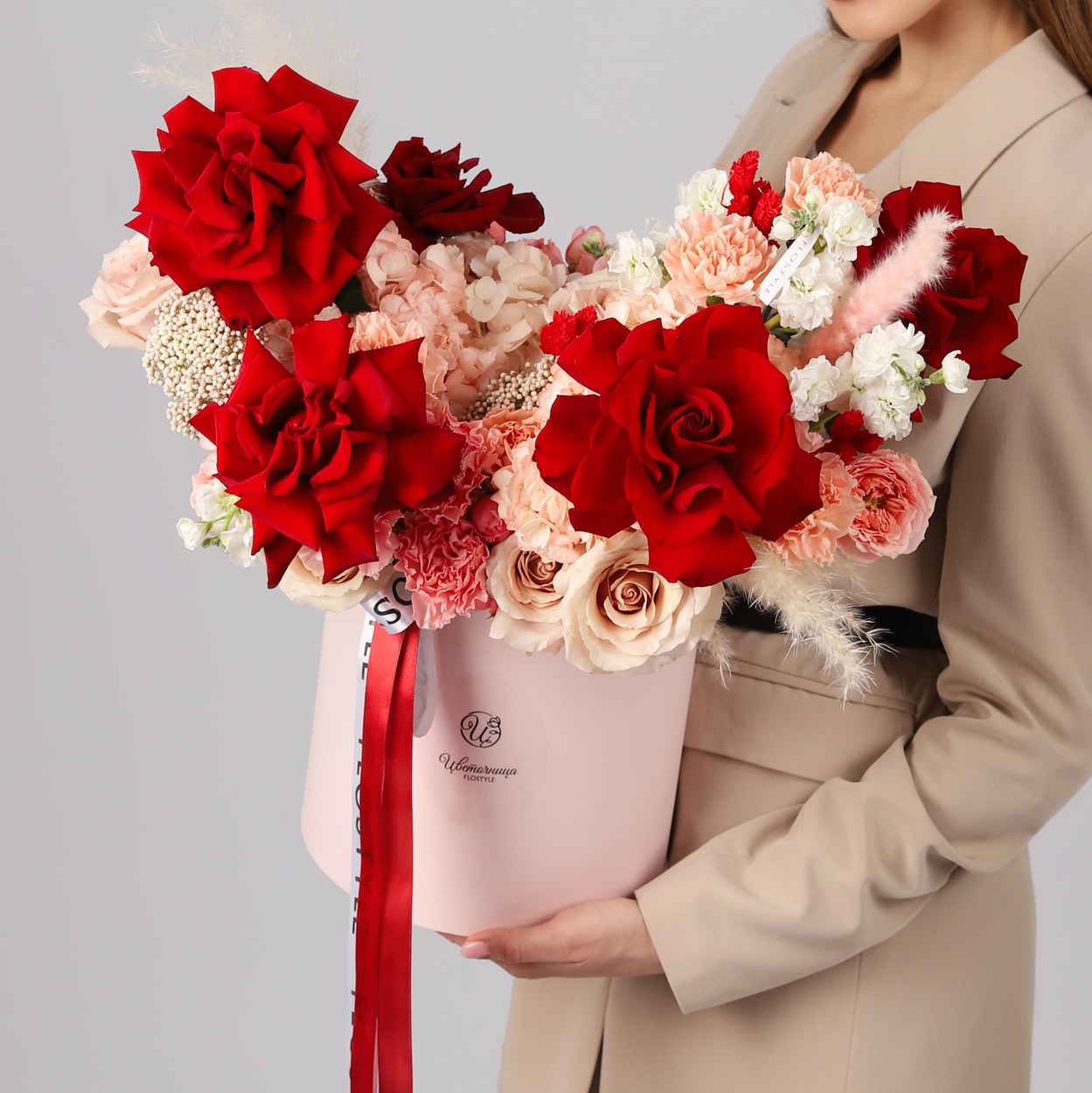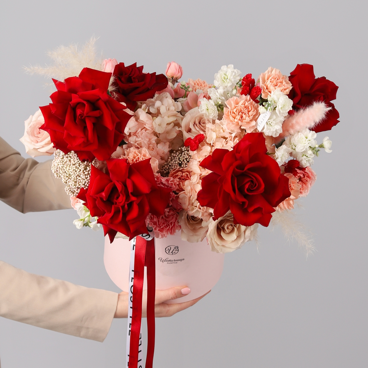 Состав: Коробка L розовая, Роза Explorer французская - 5 шт, Гортензия Pink - 3 шт, Роза Quicksand - 6 шт, Роза кустовая Juliet - 5 шт, Диантус Apple Tea/Brut - 13 шт, Маттиола White - 2 шт, Озотамнус - 2 шт, Лагурус Red - 11 шт, Помпасная трава - 3 шт, Атласная лента