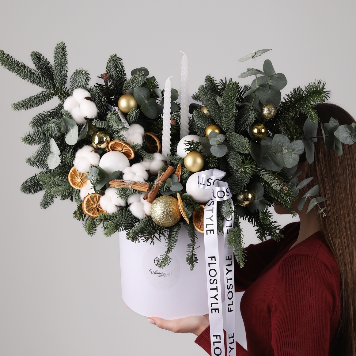 Состав: Коробка L белая, Хлопок - 9 шт, Апельсин - 6 шт, Шар большой - 2 шт, Шар средний - 9 шт, Корица - 5 шт, Свечи - 2 шт, Эвкалипт - 1 шт, Нобилис - 2,5 шт, Лента атласная