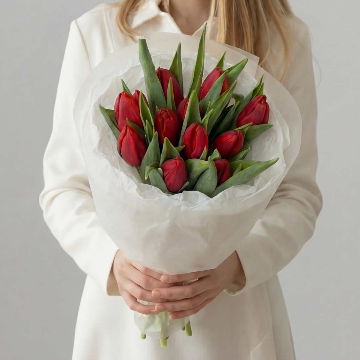 Состав: Тюльпан обычный Red - 11 шт, Тишью белая, Матовая пленка белая кругом