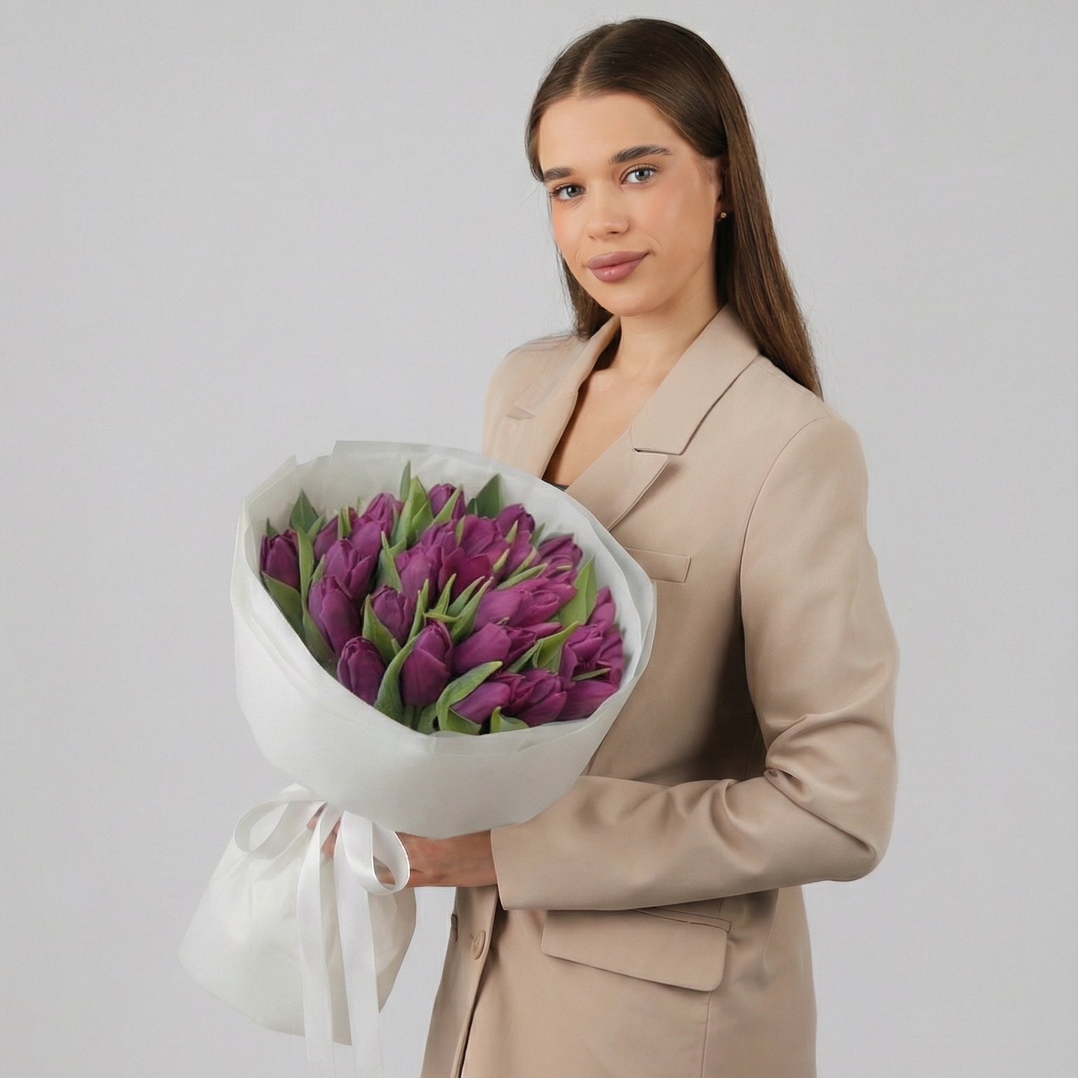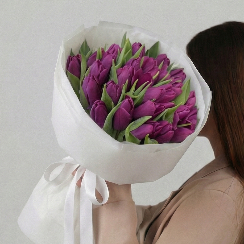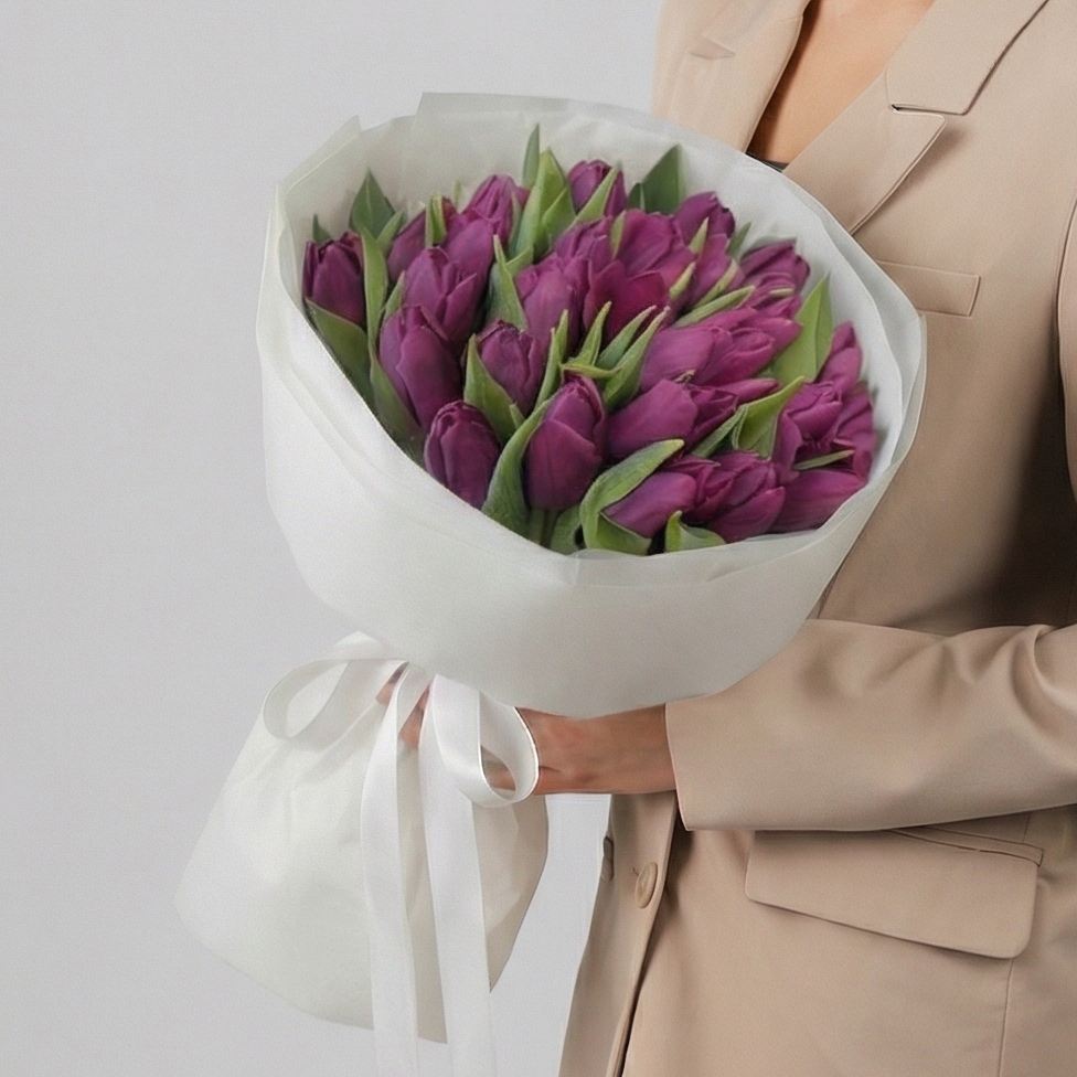 Состав: Тюльпан обычный Purple - 25 шт, Тишью белая, Матовая пленка белая кругом