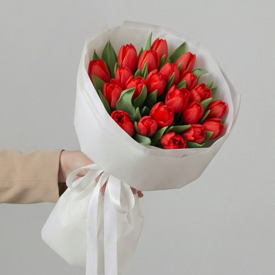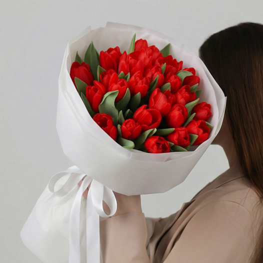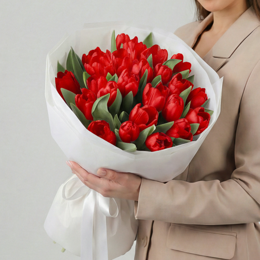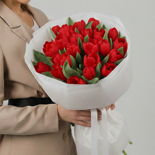 Состав: Тюльпан обычный Red - 25 шт, Тишью белая, Матовая пленка белая кругом