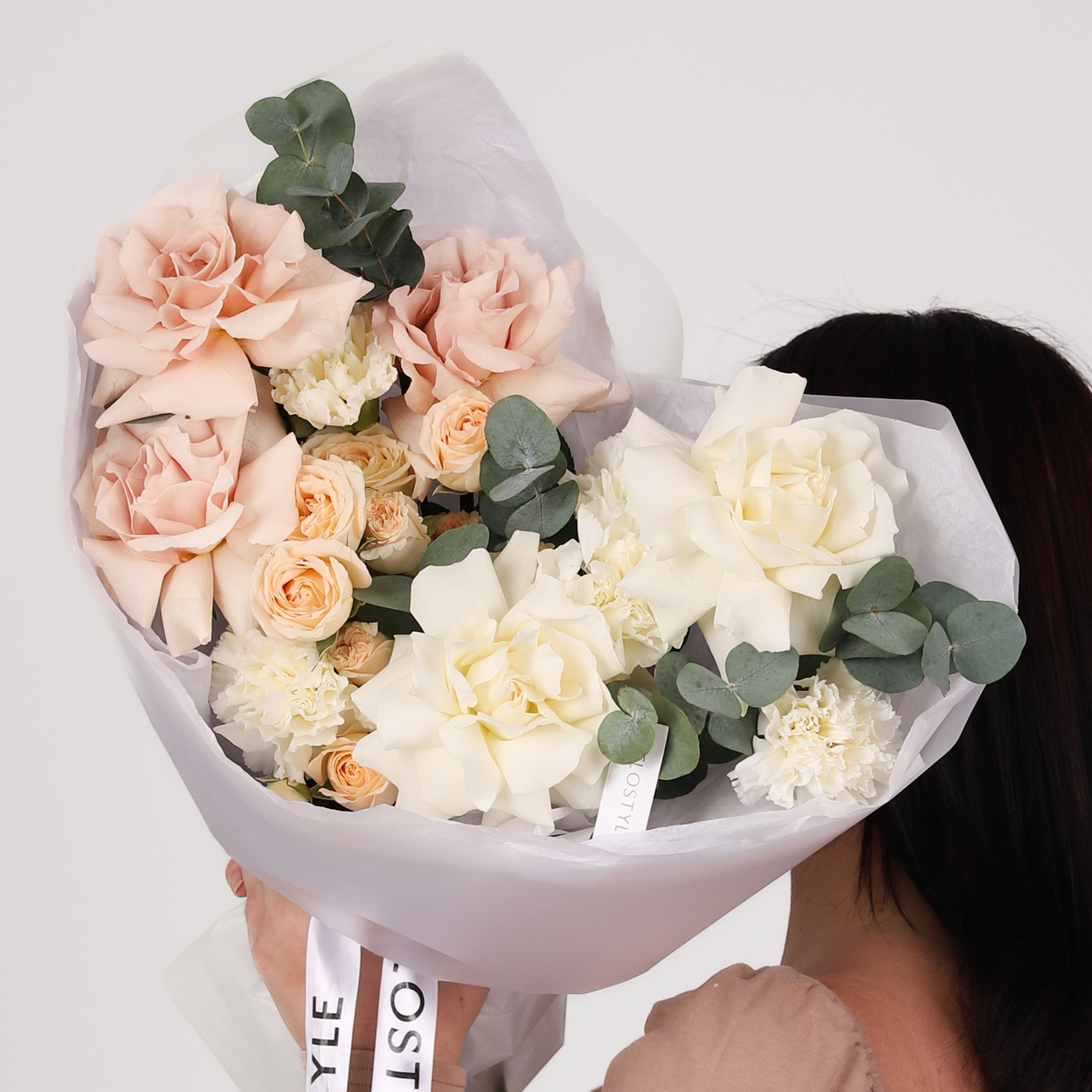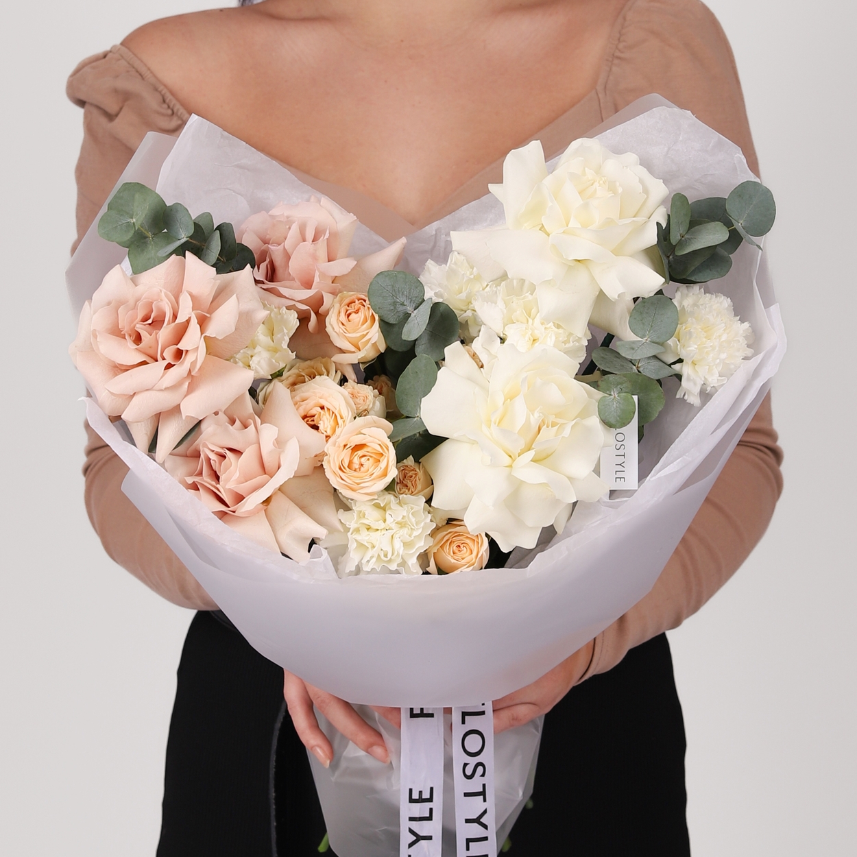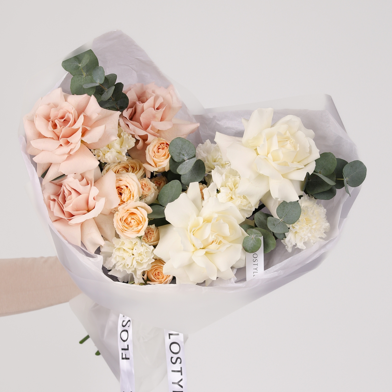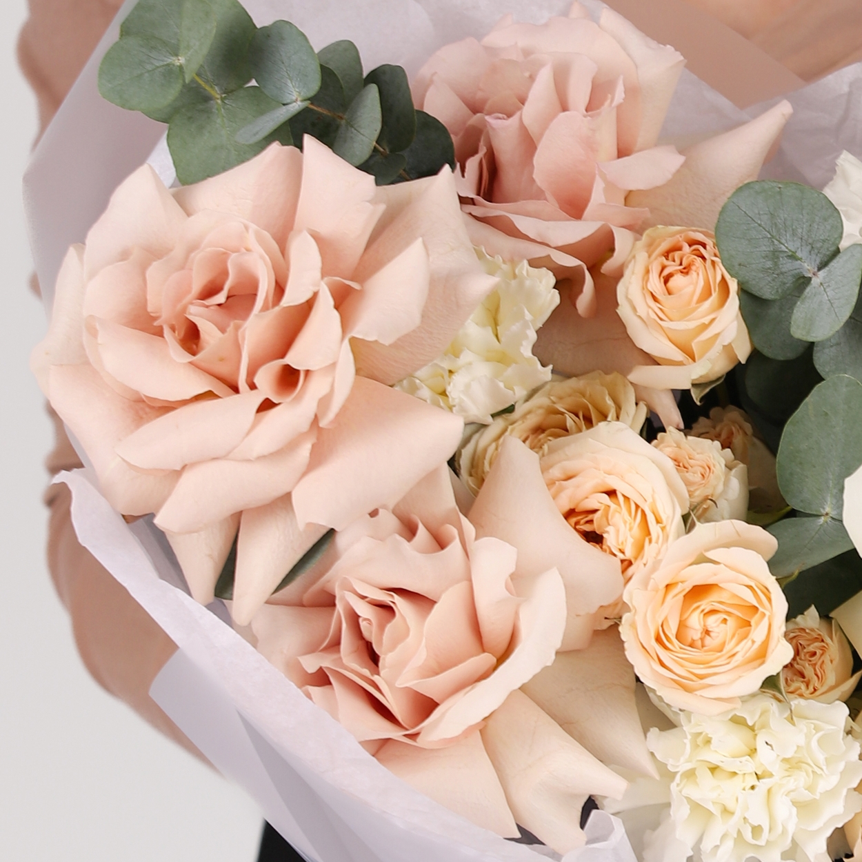 Состав: Роза Playa Blanca французская - 2 шт, Роза Quicksand французская - 3 шт, Роза кустовая Salinero - 2 шт, Диантус White - 5 шт, Эвкалипт - 1 шт, Тишью белая, Матовая пленка белая ушками
