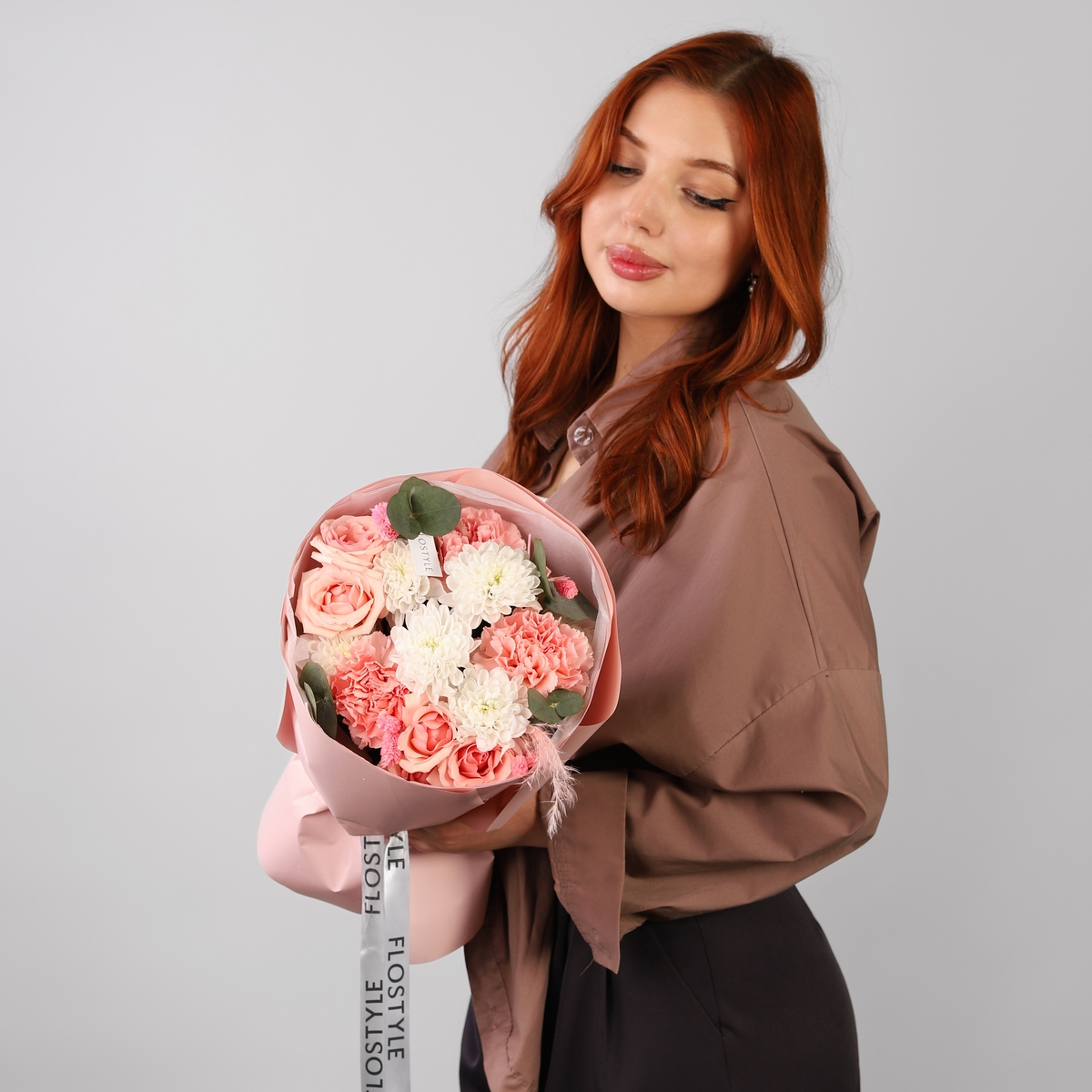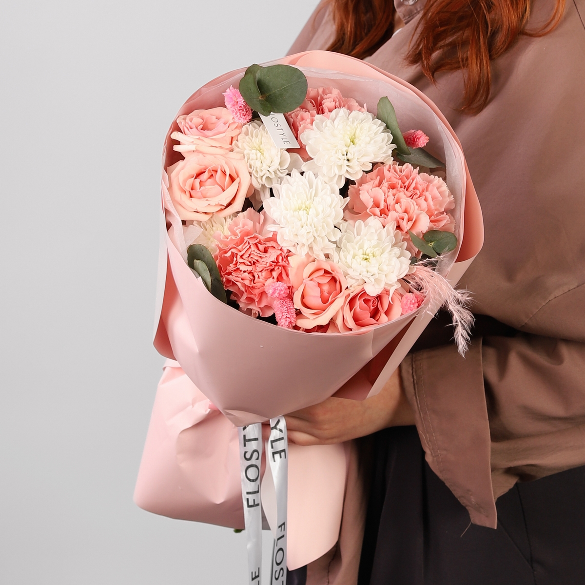 Состав: Хризантема Altaj - 1 шт, Роза кустовая Star Blush - 1 шт, Диантус Pink - 3 шт, Сухоцветы - 1 шт, Лагурус - 6 шт, Эвкалипт - 0,3 шт, Фисташка - 1 шт, Тишью белая, Матовая пленка розовая кругом