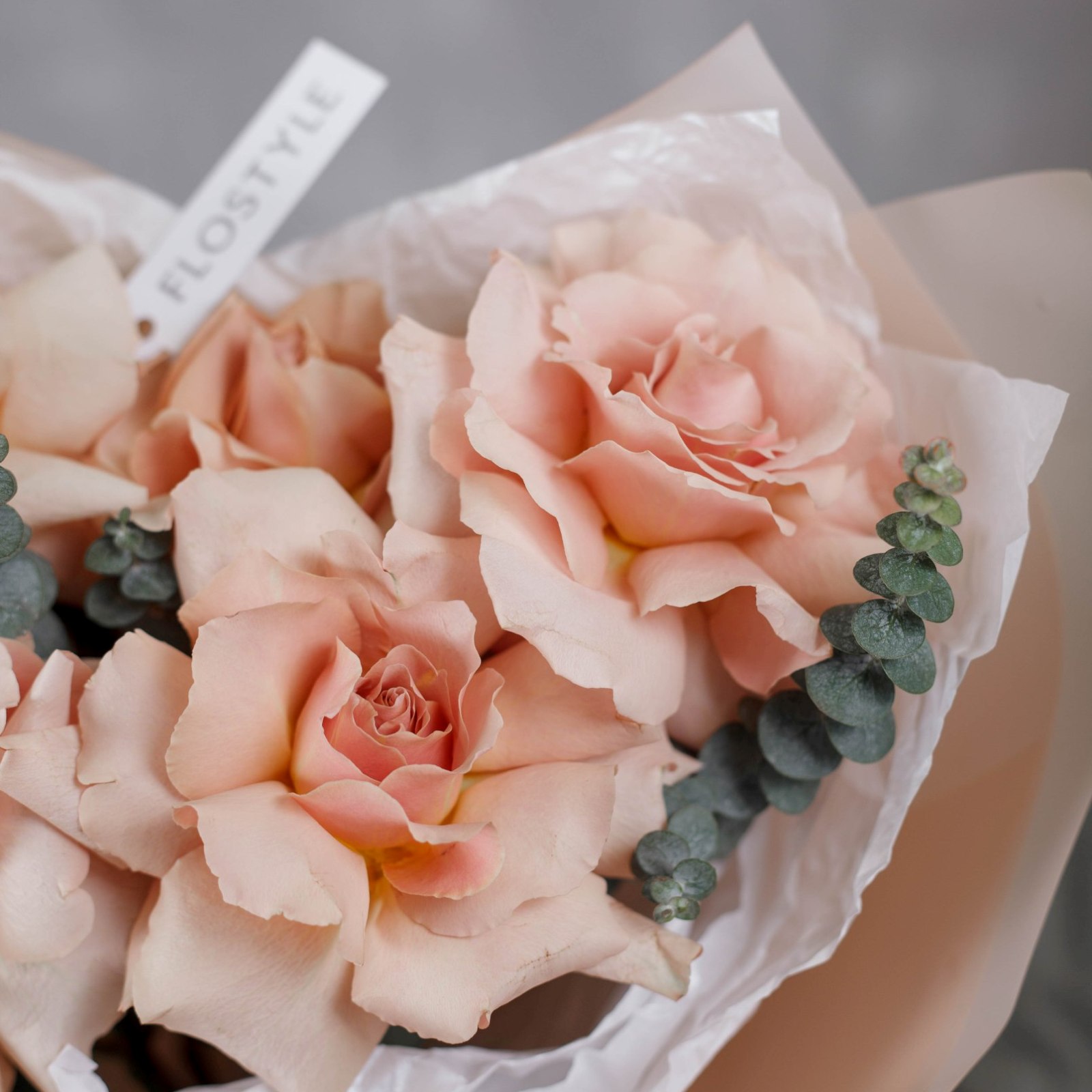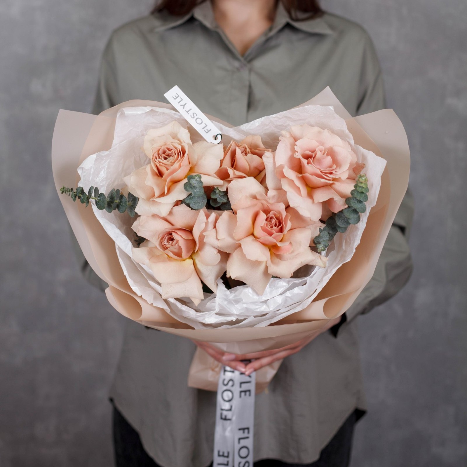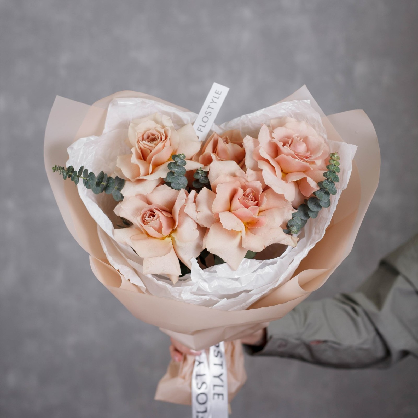 Состав: Роза Quicksand французская - 5 шт, Эвкалипт - 1 шт, Тишью белая, Матовая пленка бежевая ушками