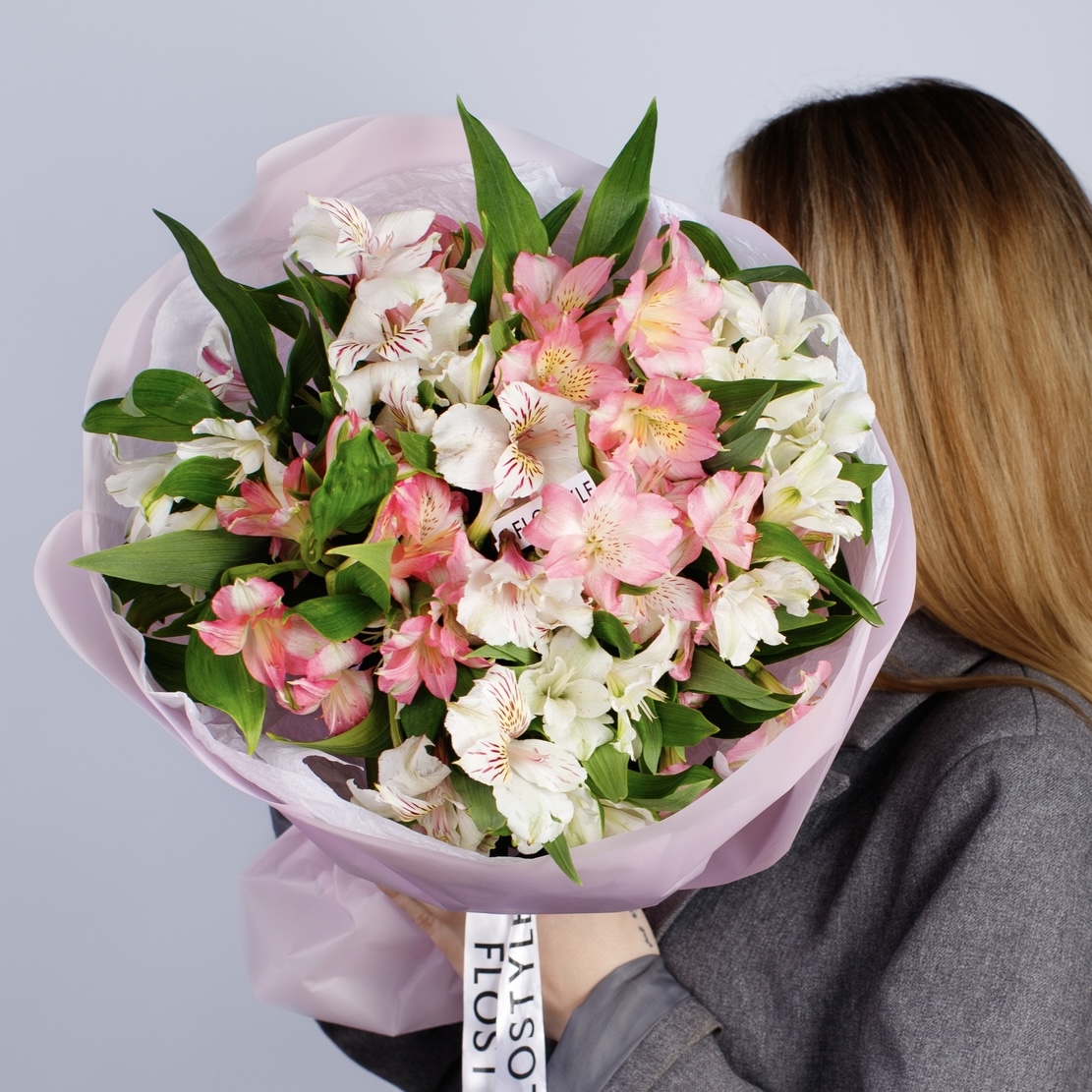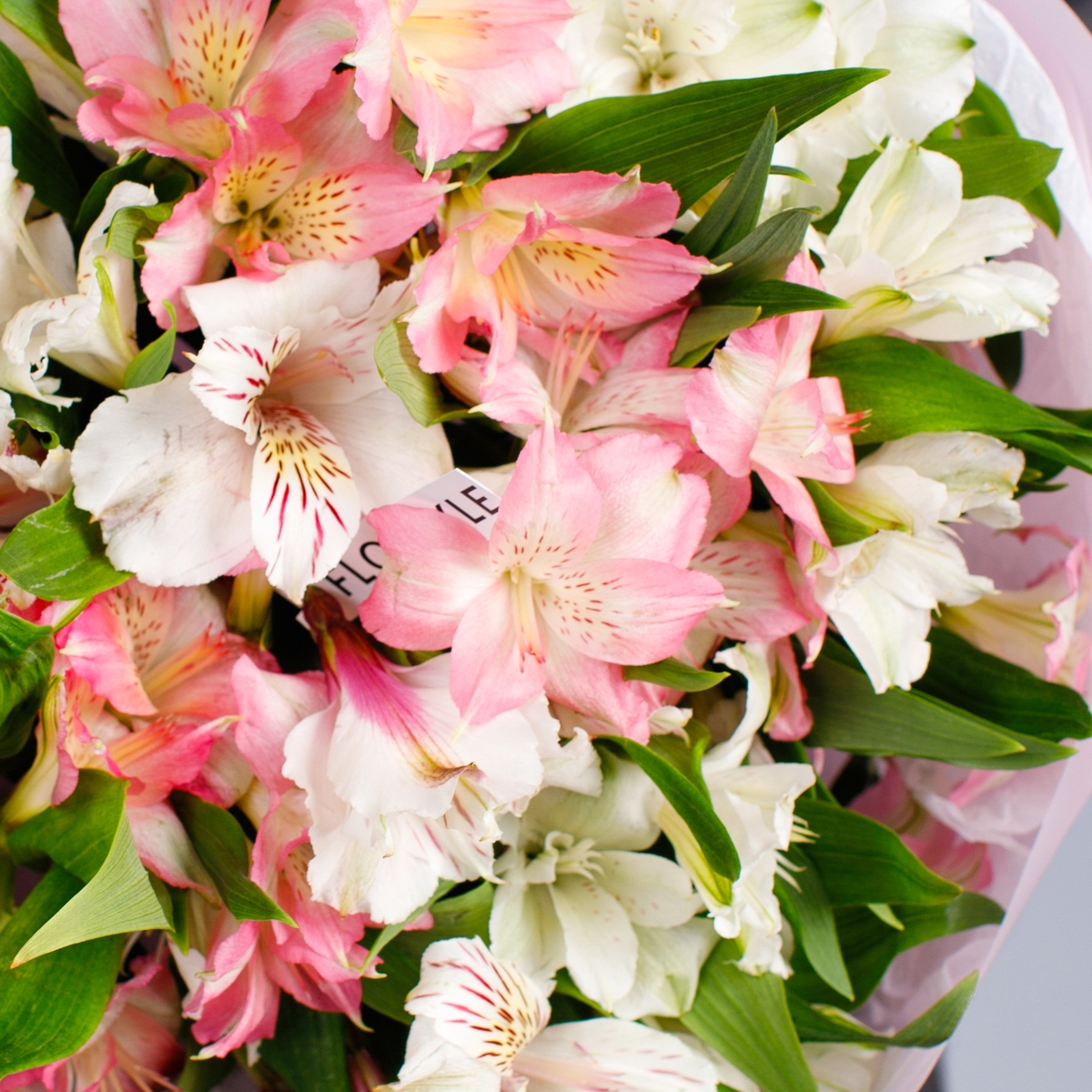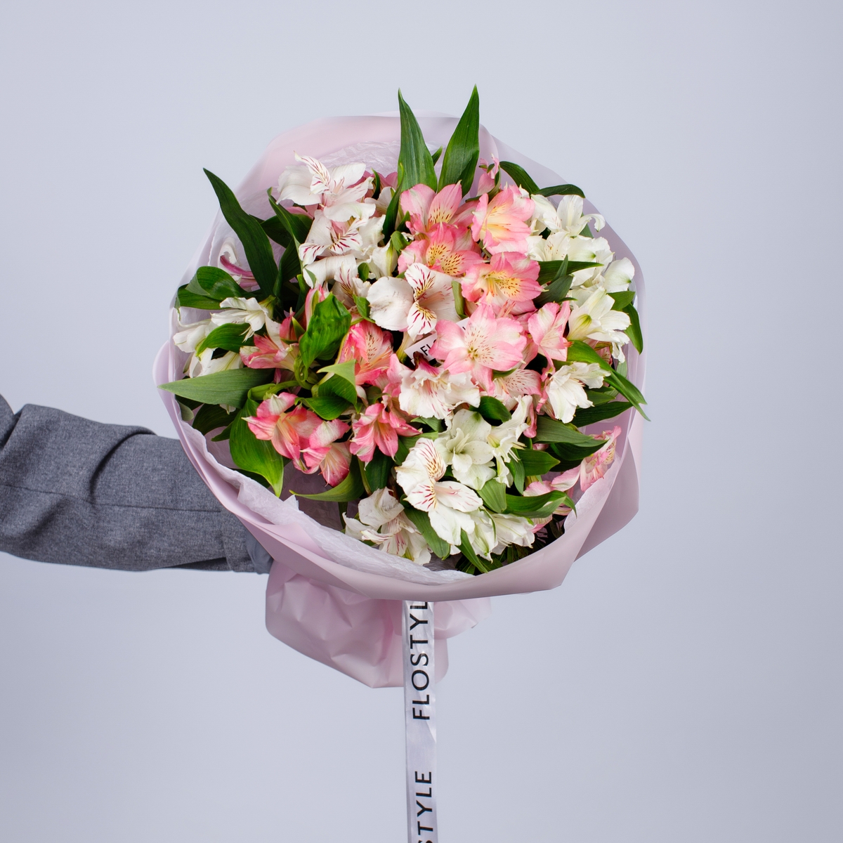Состав: Альстромерия Pink/White - 15 шт, Фисташка - 2 шт, Тишью белая, Матовая пленка розовая кругом