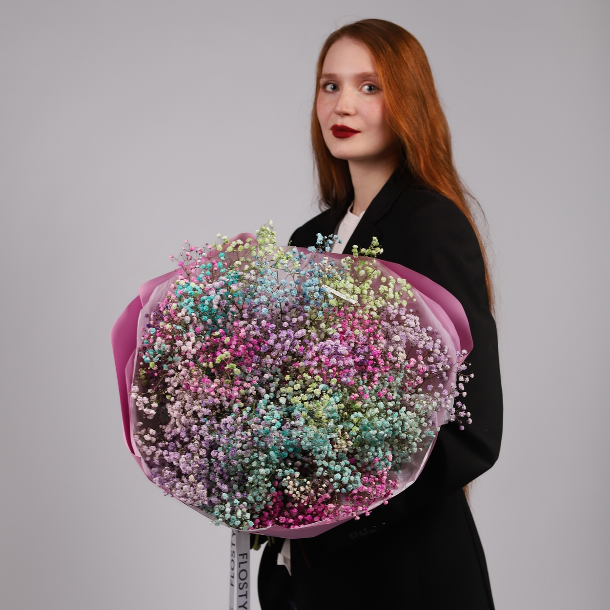Состав: Гипсофила микс - 15 шт, Тишью белая, Матовая пленка сиреневая кругом