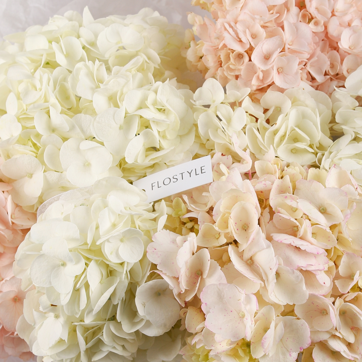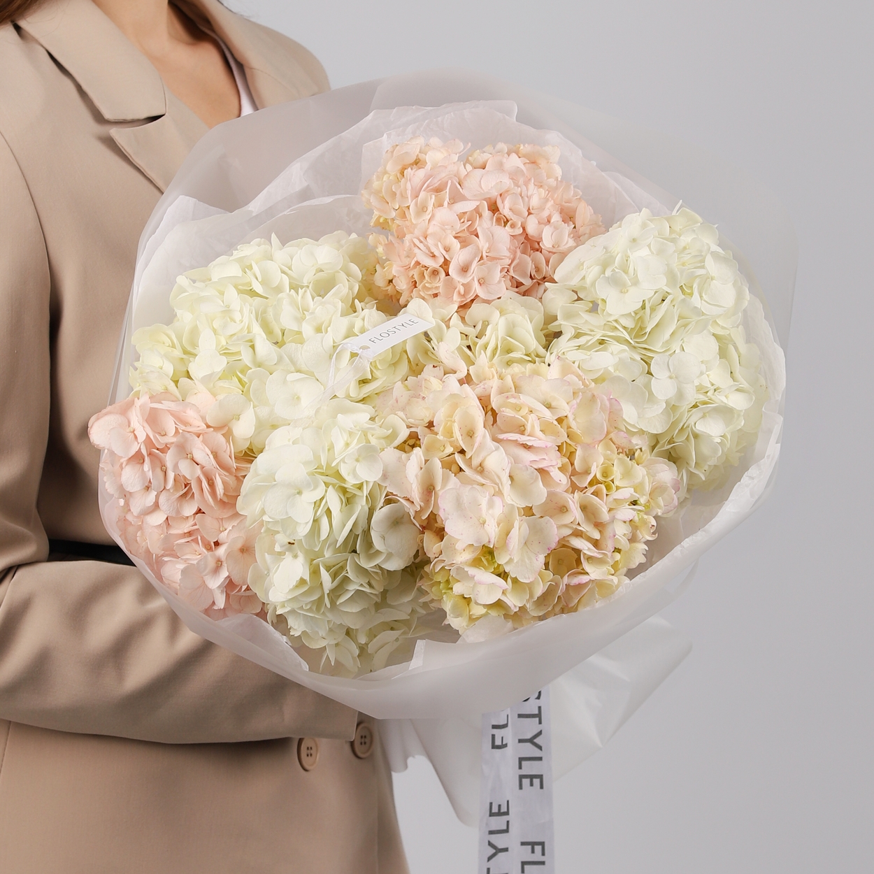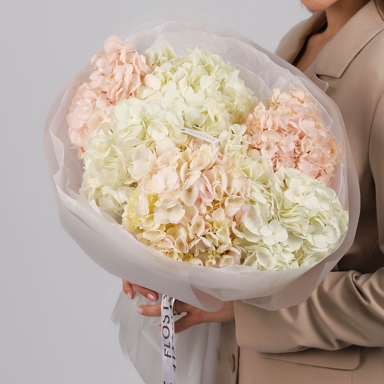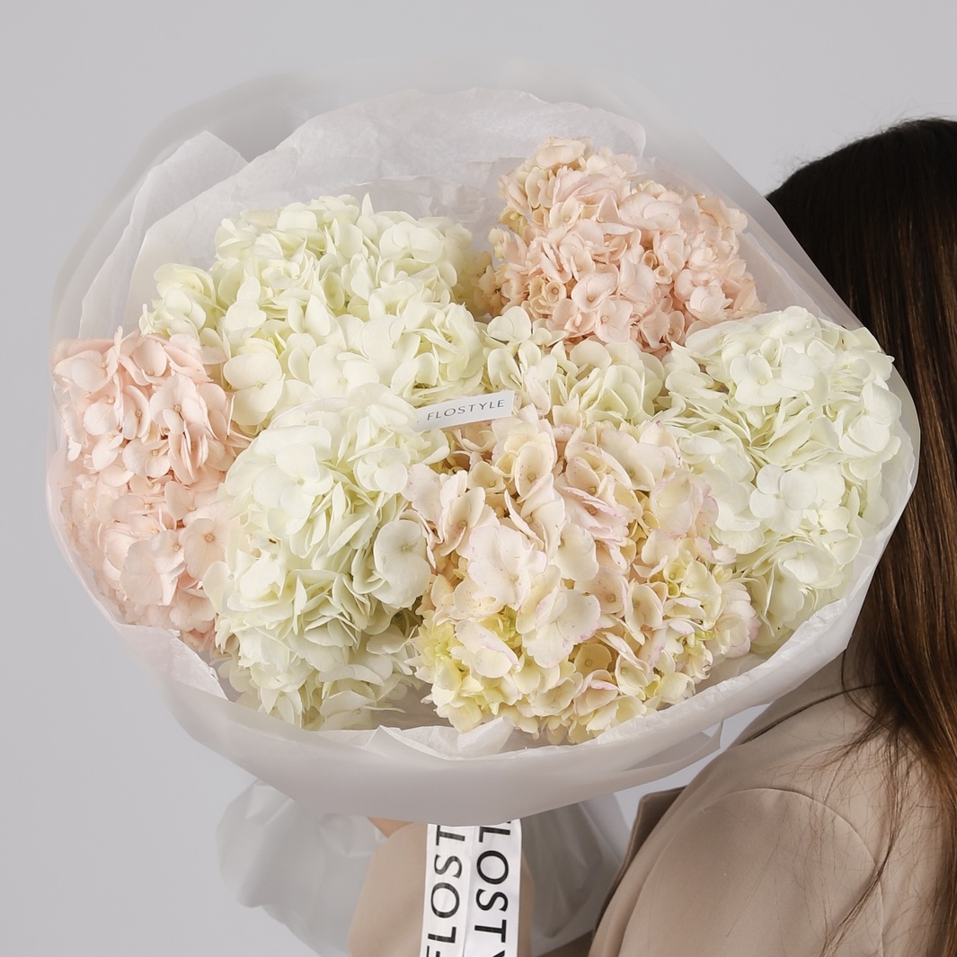 Состав: Гортензия Pink/White - 7 шт, Тишью белая, Матовая пленка белая кругом