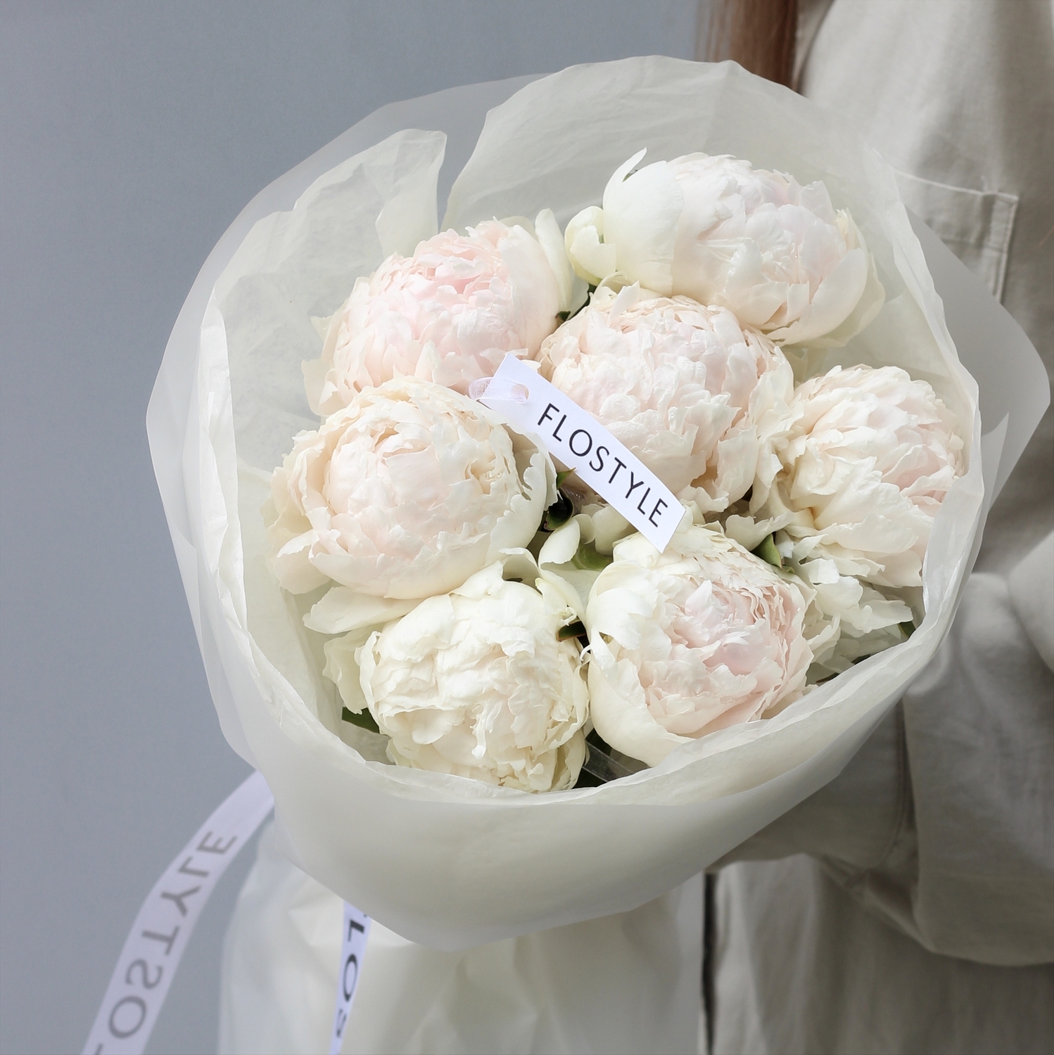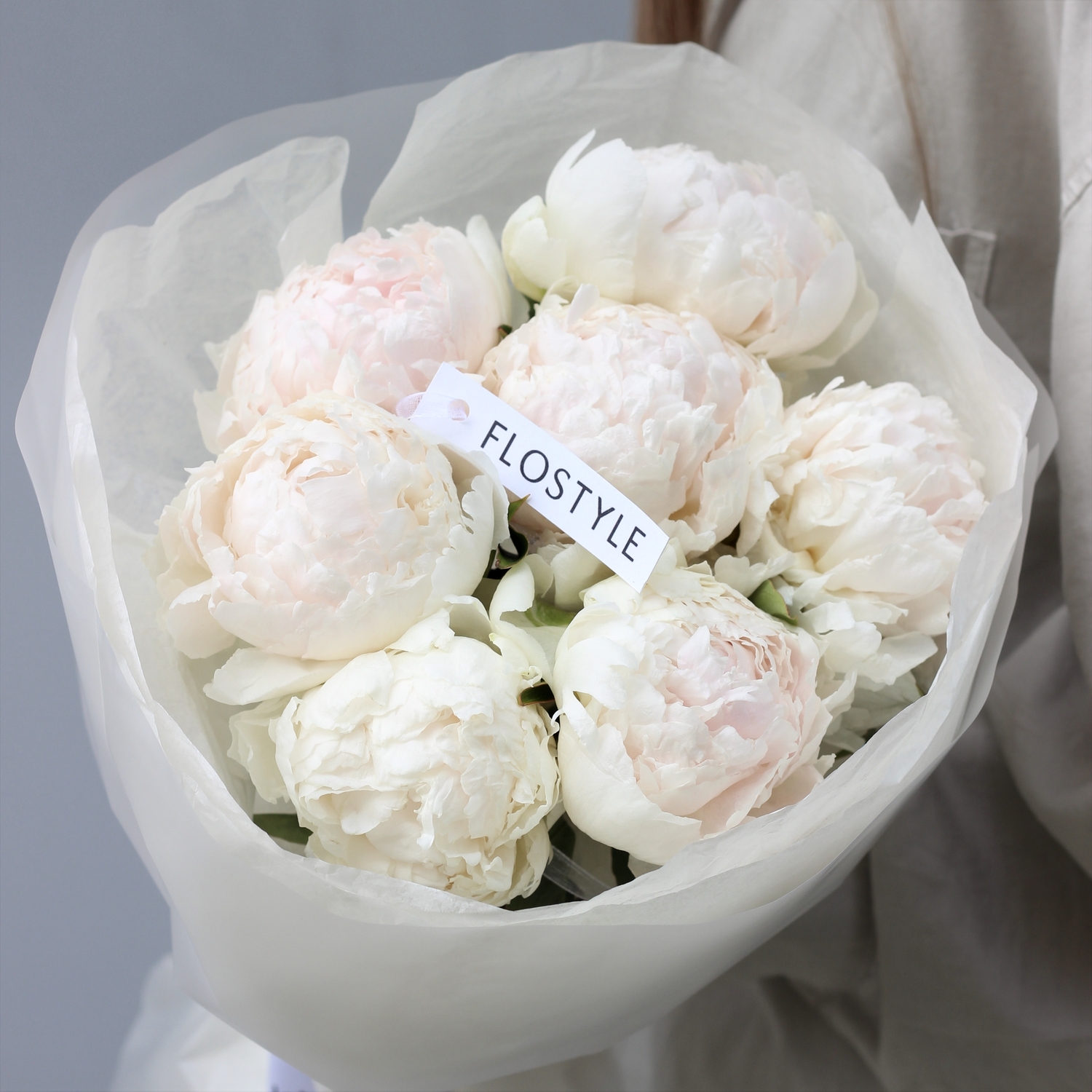 Состав: Пионы White - 7 шт, Тишью белая, Матовая пленка полупрозрачная кругом