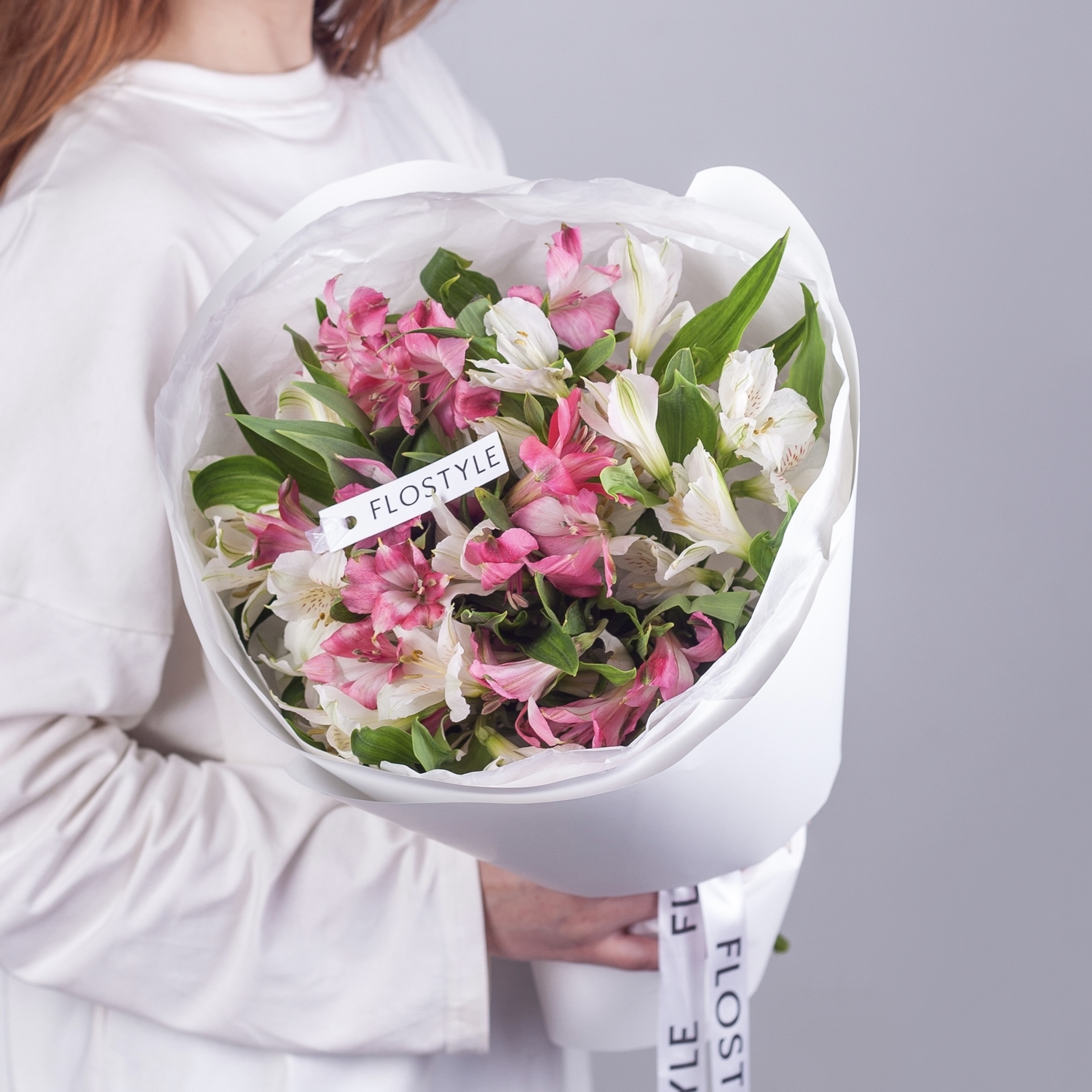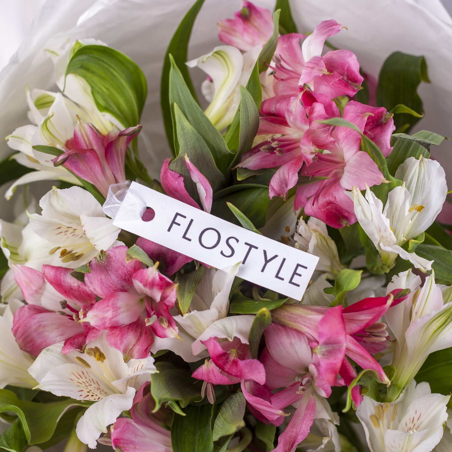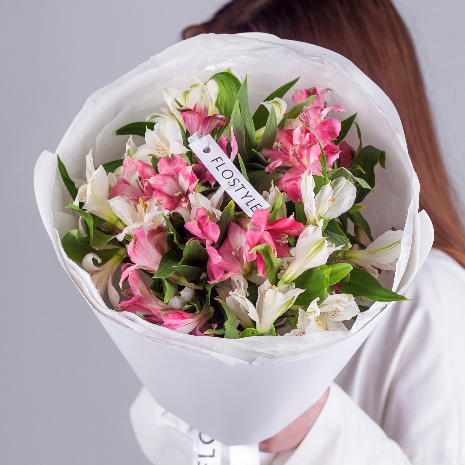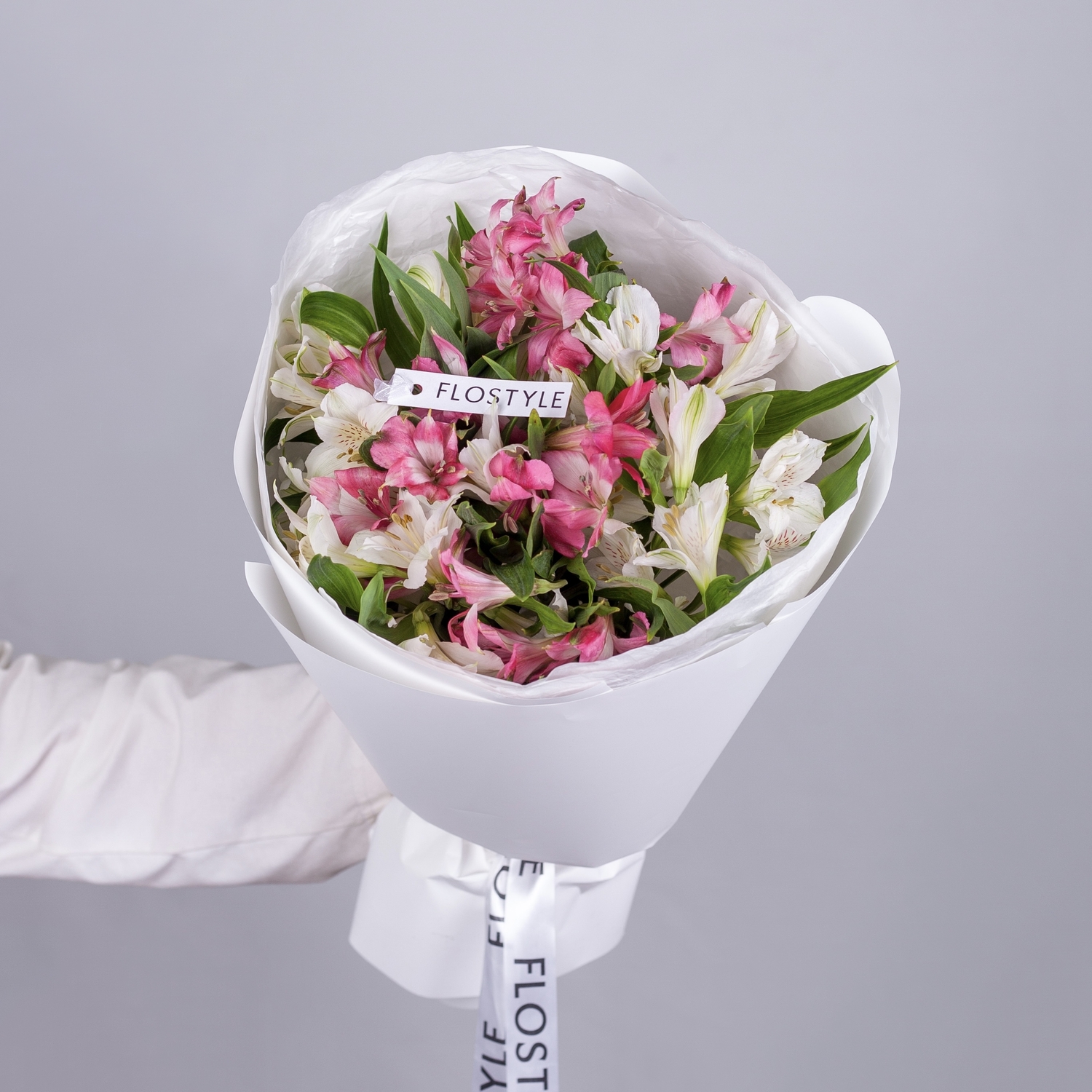 Состав: Альстромерия Pink - 5 шт, Альстромерия White - 4 шт, Фисташка - 1 шт, Тишью белая, Матовая пленка белая кругом