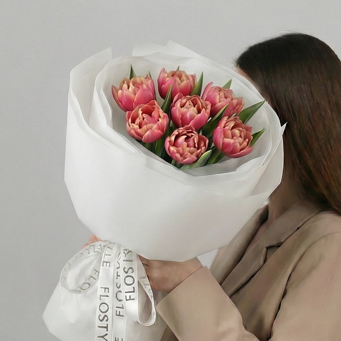 Состав: Тюльпан пионовидный Коламбус - 7 шт, Тишью белая, Матовая пленка белая кругом