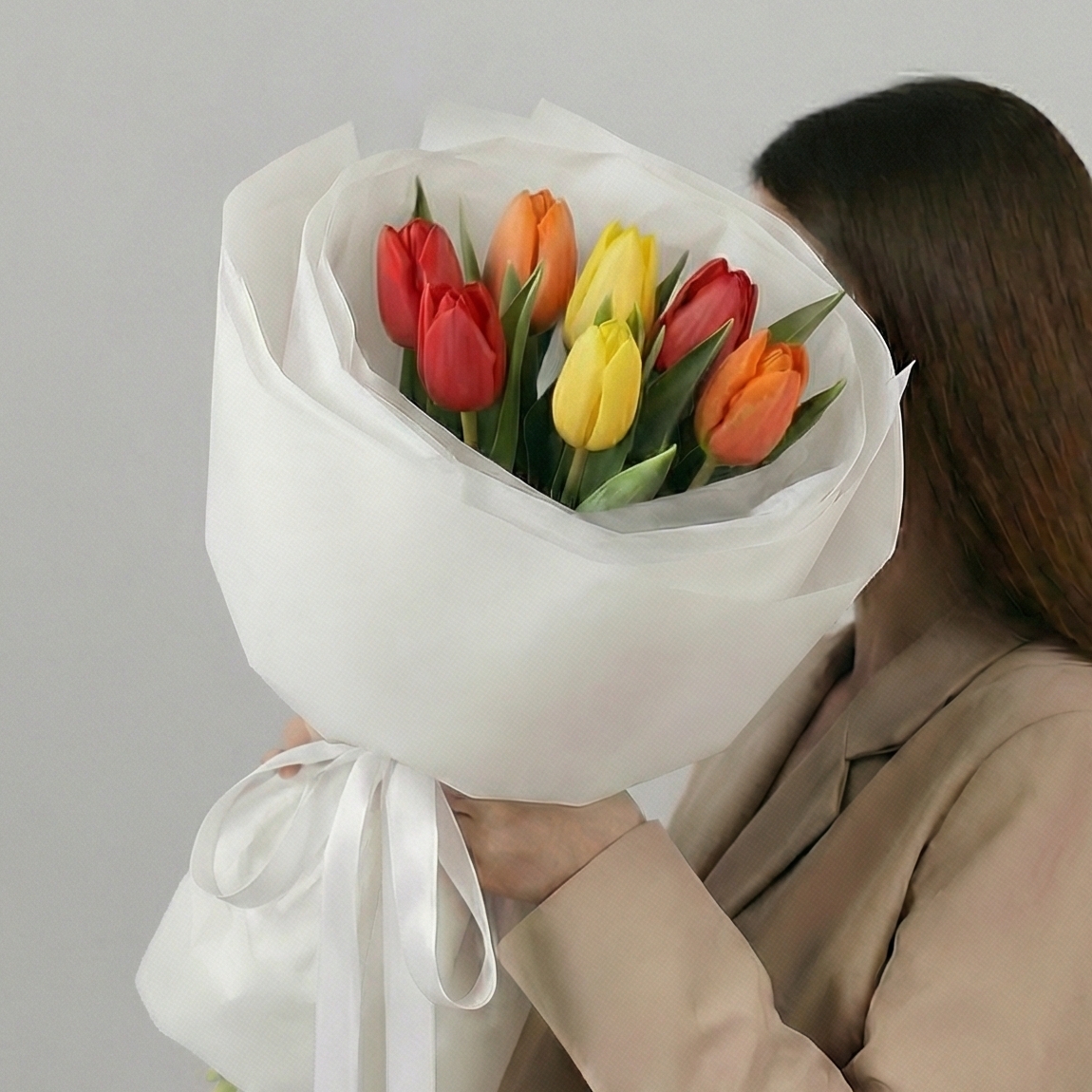 Состав: Тюльпан обычный (красн, желт, оранж) - 7 шт, Тишью белая, Матовая пленка белая кругом