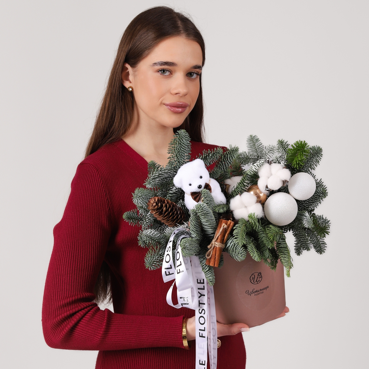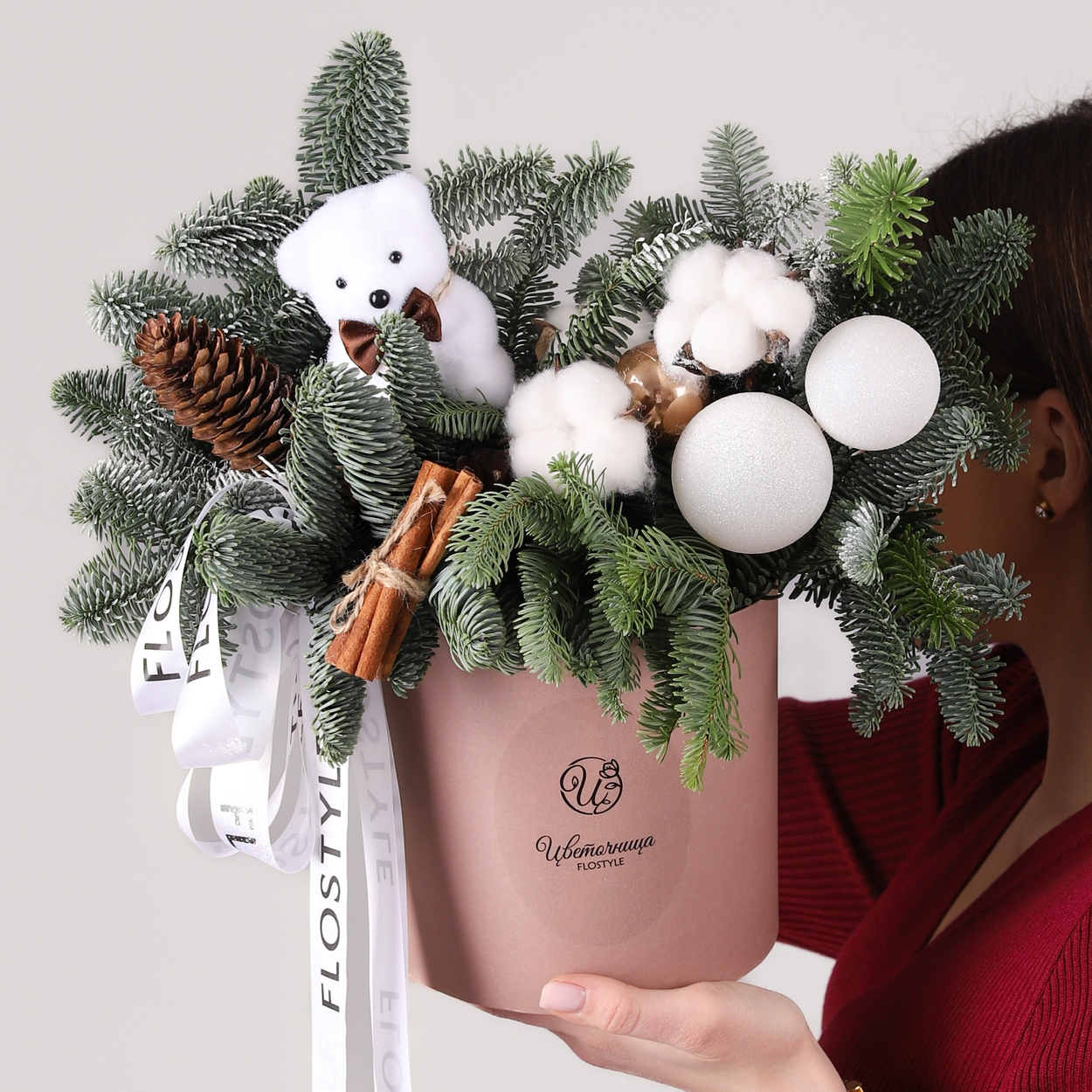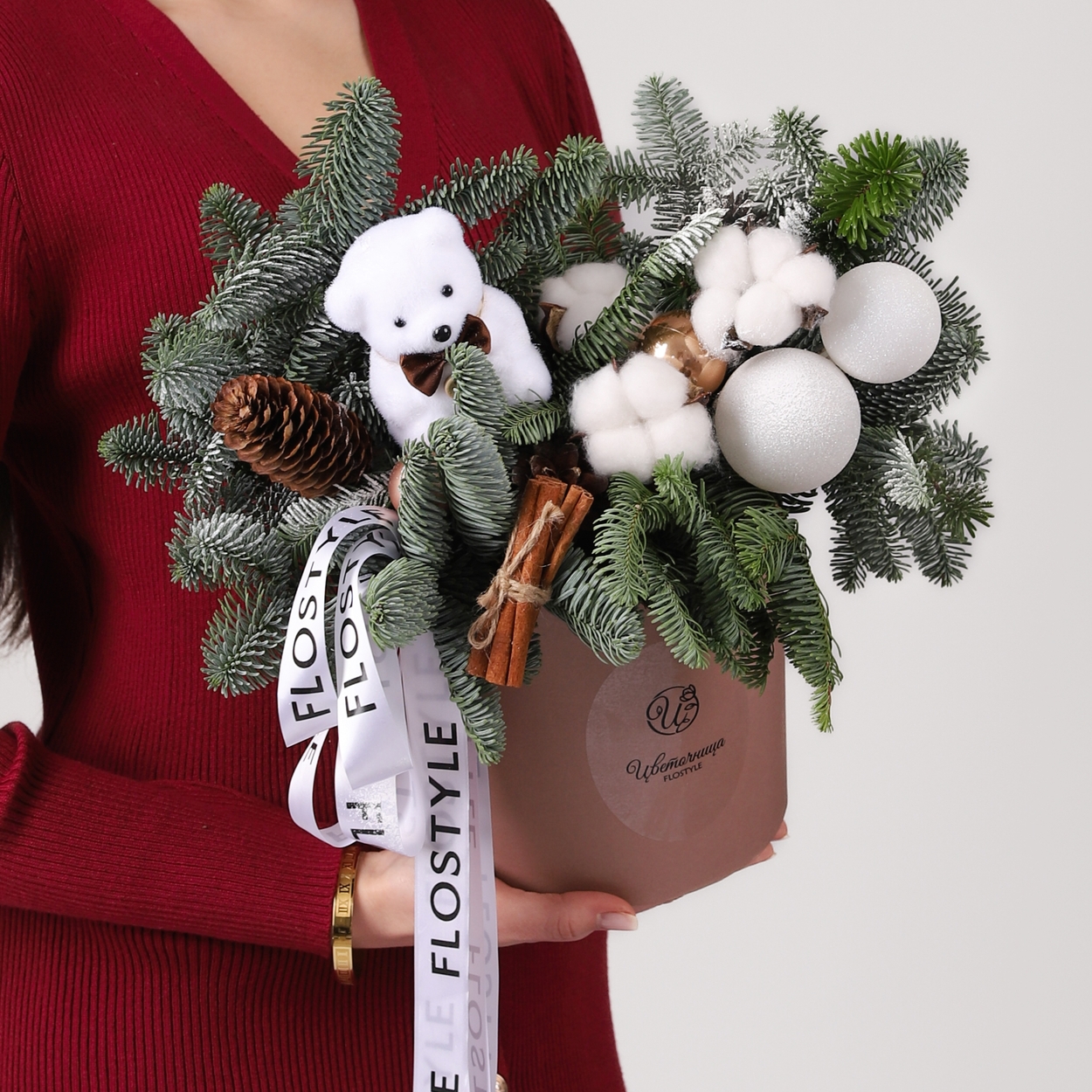 Новогодняя композиция в шляпной коробке с мишкой model №904