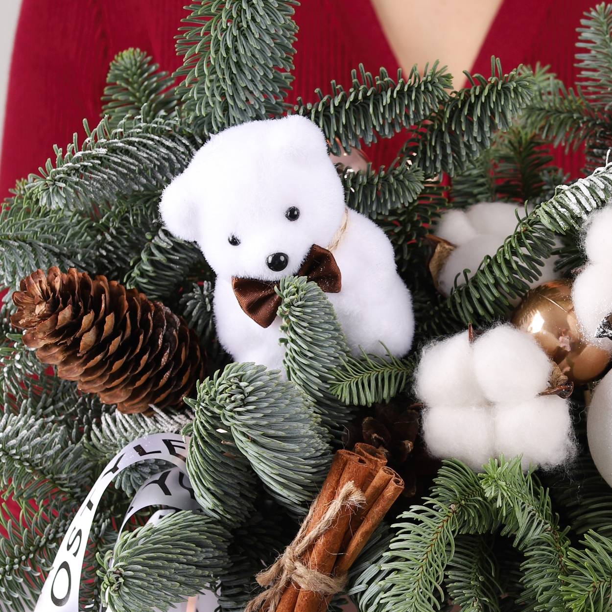 Состав: Коробка S крафт, Медведь игрушка - 1 шт, Шар большой - 1 шт, Хлопок - 3 шт, Шишка сосна - 1 шт, Шишка ел - 1 шт, Шар средний - 2 шт, Корица - 3 шт, Нобилис - 1 шт, Лента Атласная