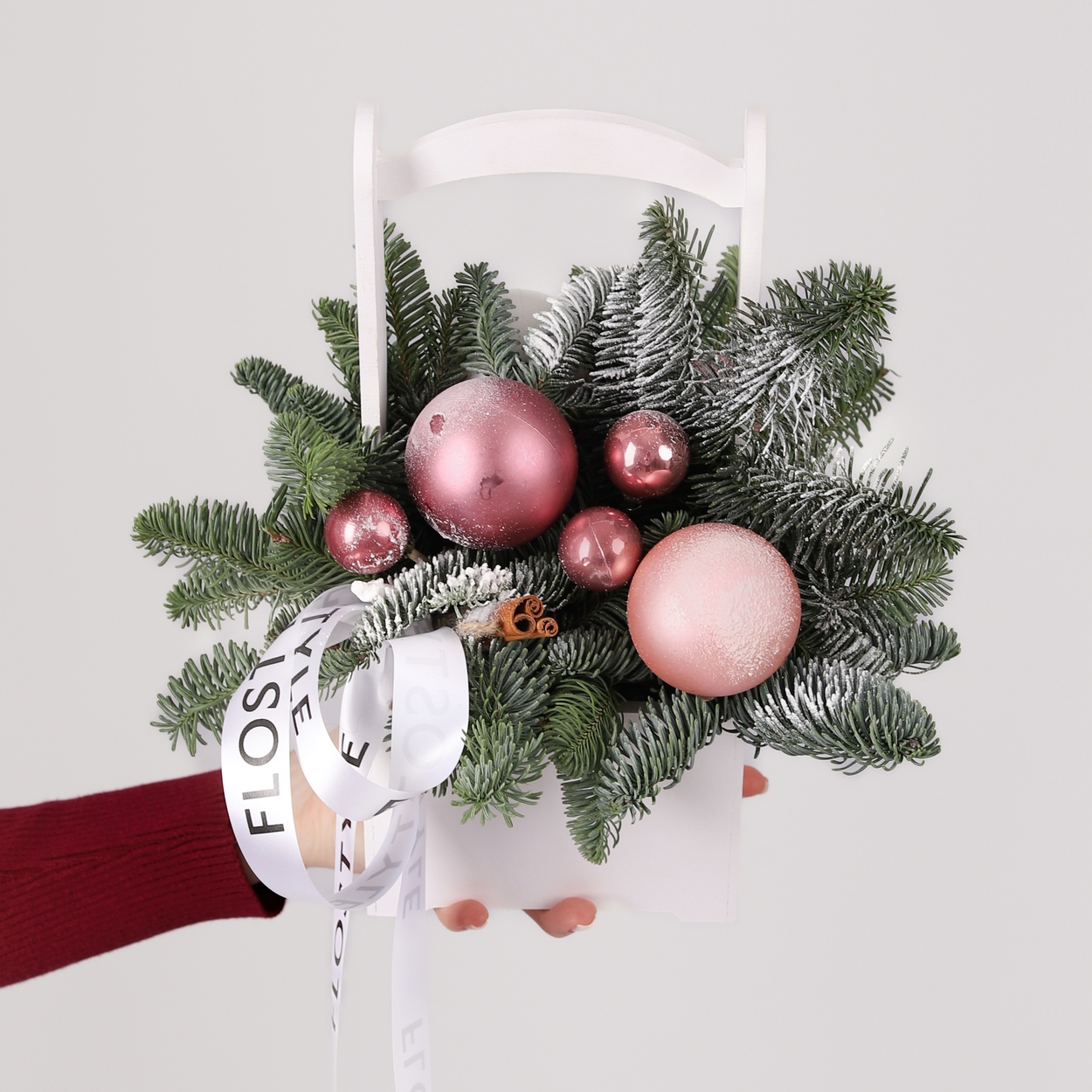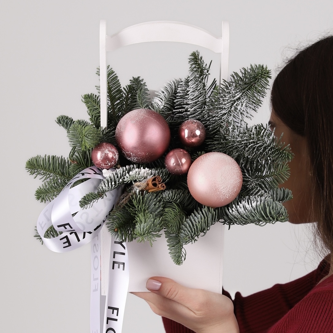Состав: Ящик S белый, Шар большой - 3 шт, Шар маленький - 4 шт, Шар средний 1 шт, Корица - 2 шт, Нобилис - 0,5 шт, Лента атласная